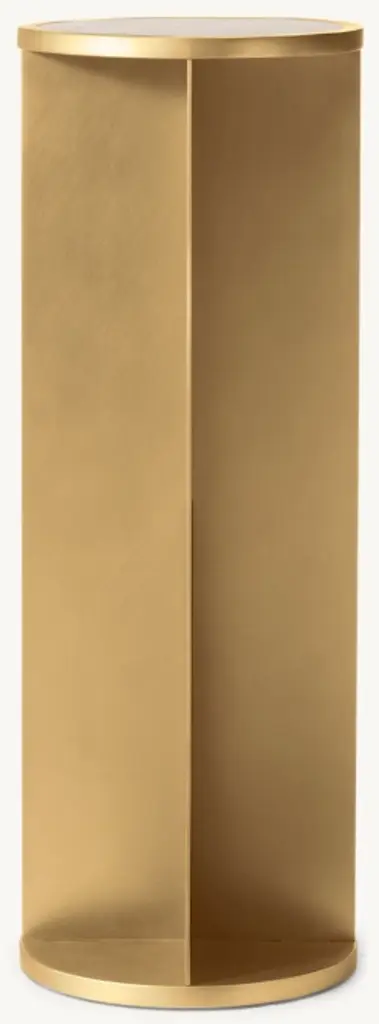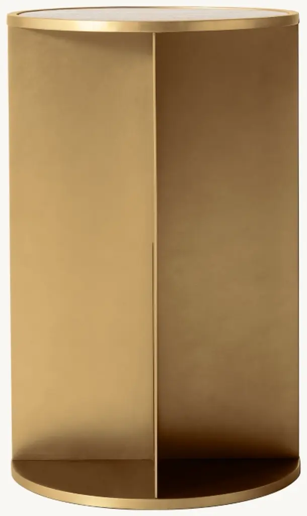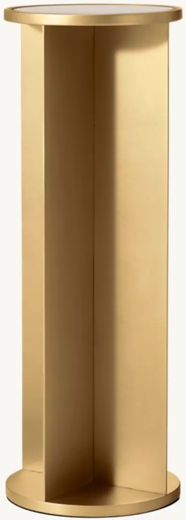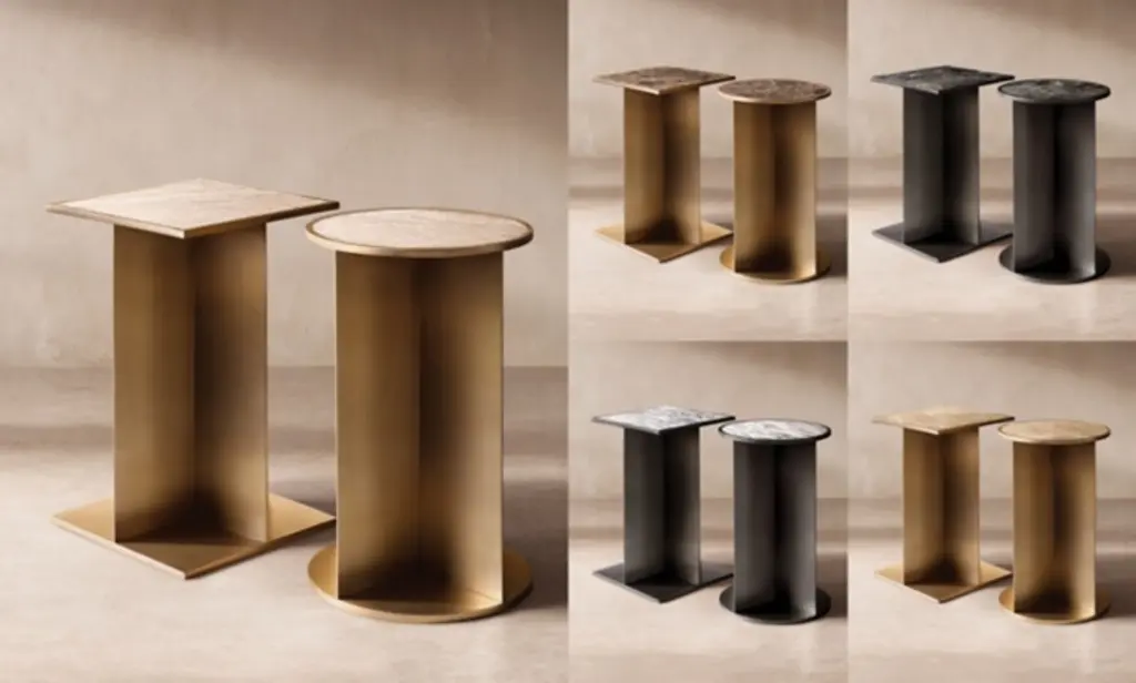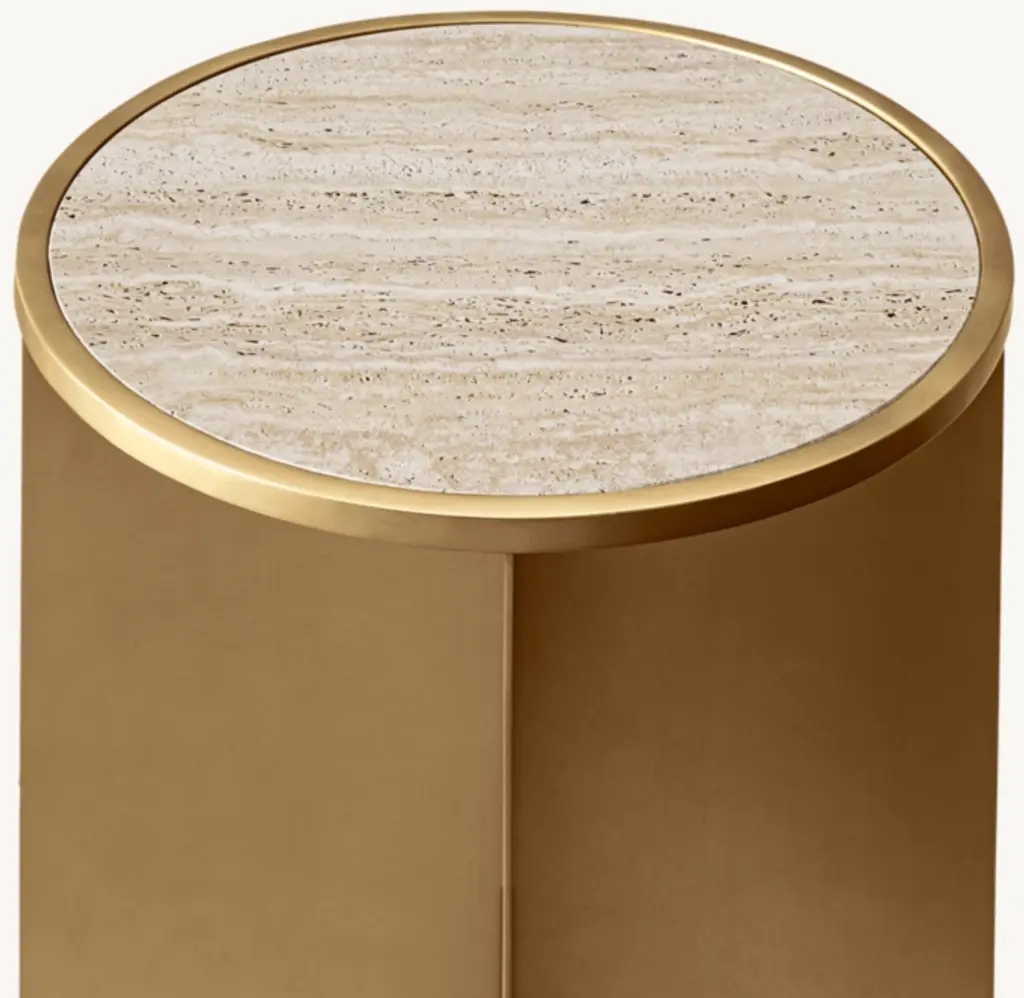 A study in symmetry and restraint, our Cullen collection recalls classic midcentury modern designs. The geometric contours are handcrafted from stainless steel and feature a column of interlocking planes rising to the tabletop inlaid with richly veined stone, its minimalist shape echoing the base.