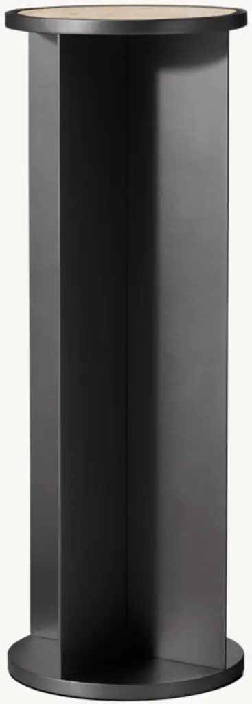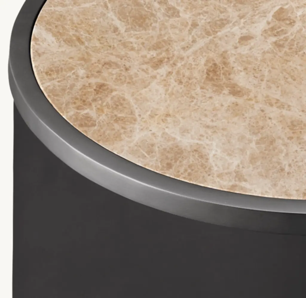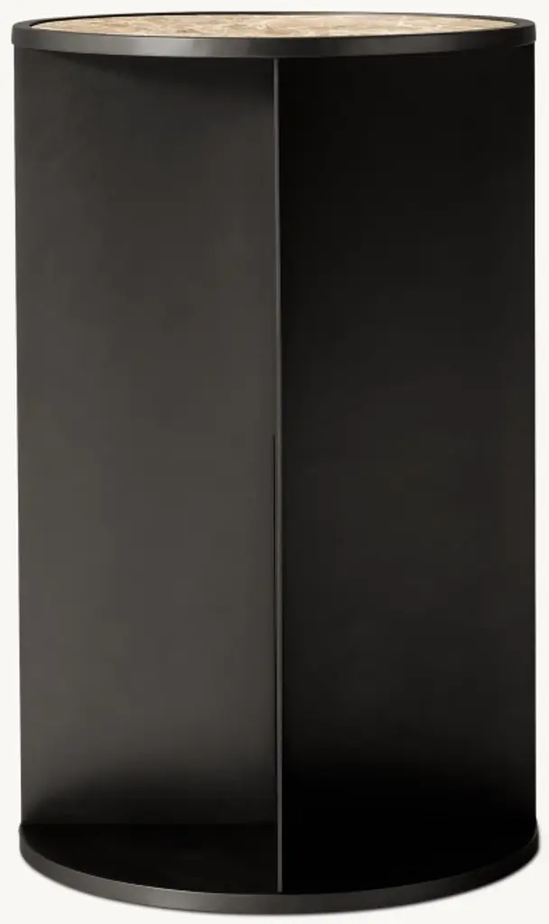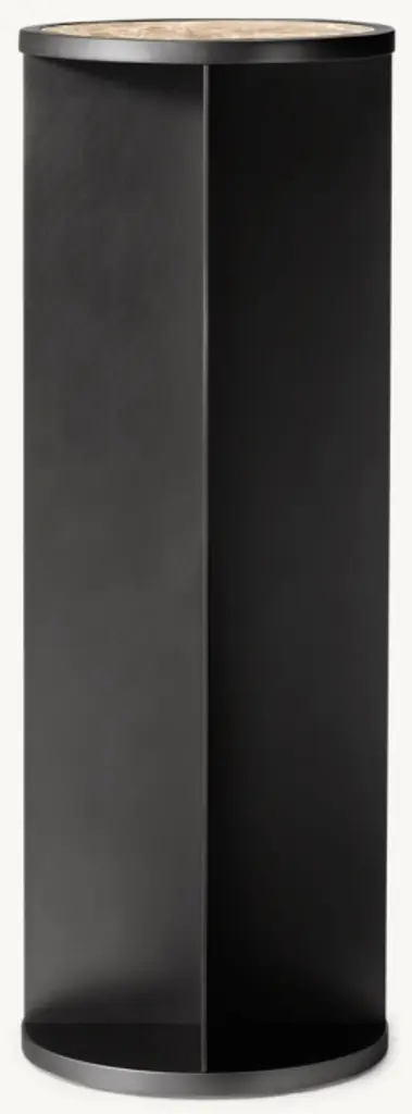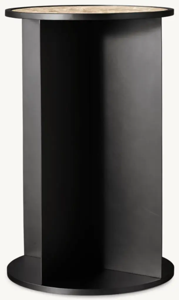 A study in symmetry and restraint, our Cullen collection recalls classic midcentury modern designs. The geometric contours are handcrafted from stainless steel and feature a column of interlocking planes rising to the tabletop inlaid with richly veined stone, its minimalist shape echoing the base.