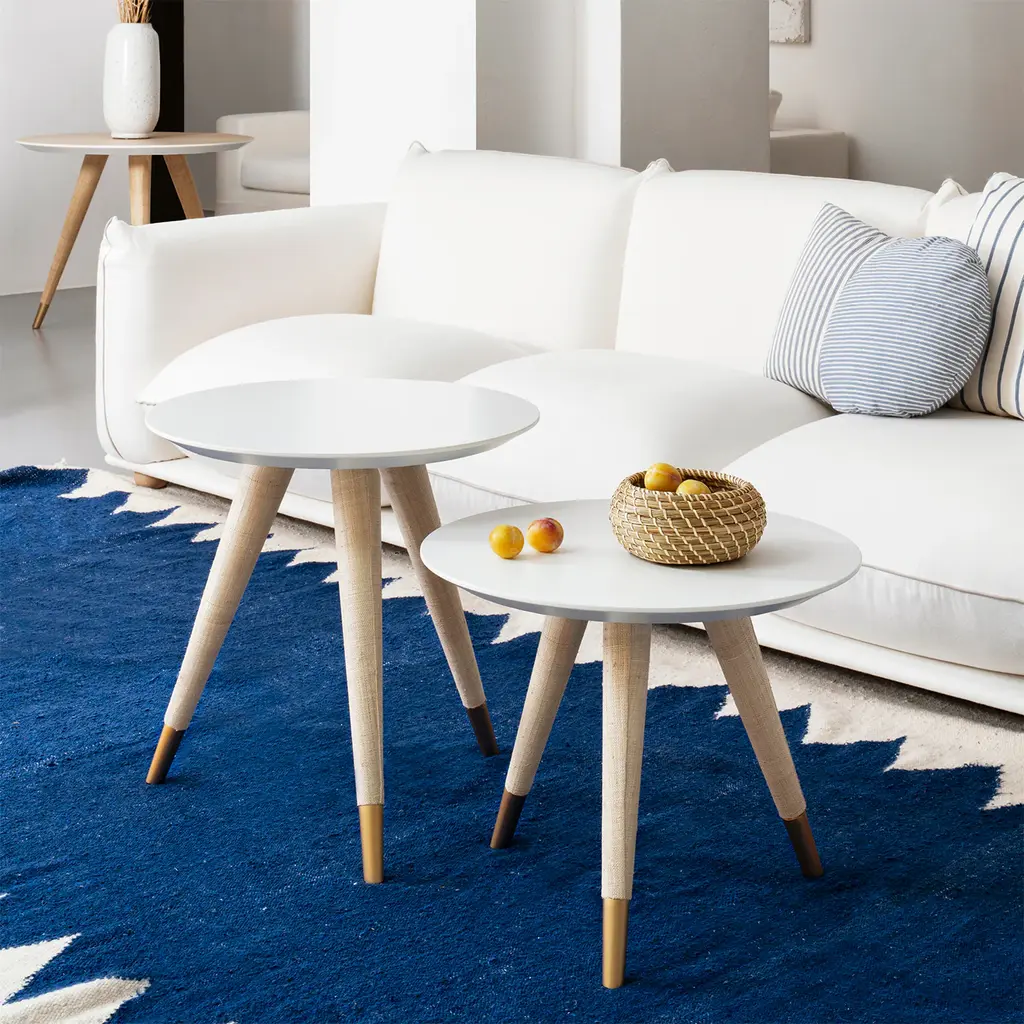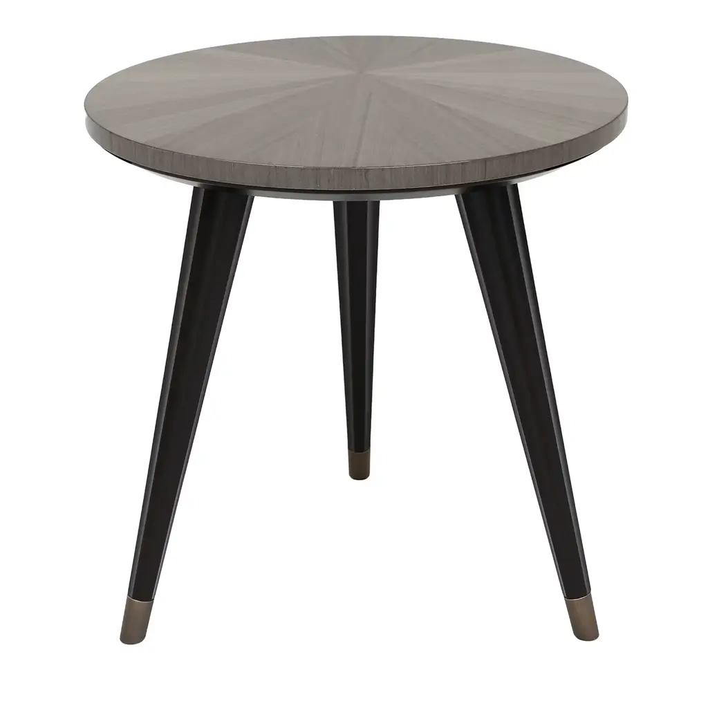 Essential and minimalism, this small side table is comprised of a round white-lacquered wooden top and a tripod of upholstered legs showcasing metal feet. A perfect addition to a contemporary interior of sober character. Please consult the Concierge for further information on materials and finishes.