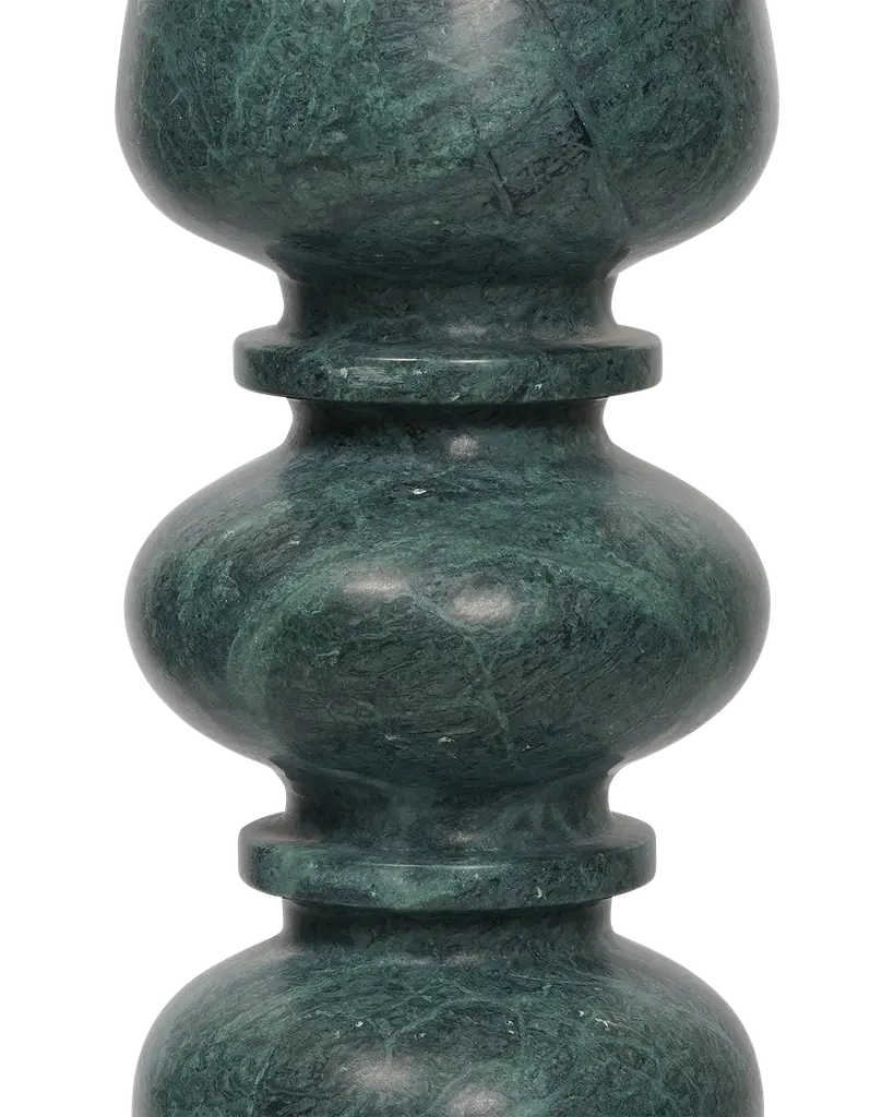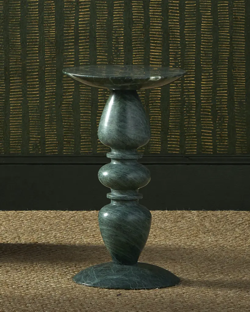 The Nubia Green Accent Table is like a beautiful chess piece with its turned column rising a round base that echoes the shape of the top. The steep bullnose on the underside of the top is also repeated, in reverse, on the base. Because this accent table is made of natural evergreen marble, the veining on each one will be unique. The top, base, and column are shipped together in three pieces. Wipe clean with a soft, dry cloth or static duster. Always avoid the use of harsh chemicals or abrasive cleaners as they may cause damage to the item's finish.