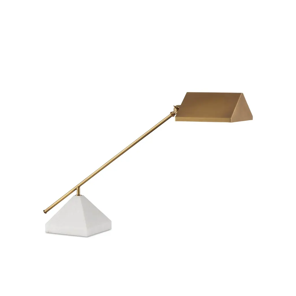 With its base made of a solid pyramid of marble, the Repertoire Brass Desk Lamp is a larger than the average-sized task light, so it will illuminate more of the surface on a grandly scaled desk. The metal in an antique brass finish is a warm contrast to the pale white marble. Though the shape of the shade brings the gold desk lamp a nostalgic touch, the contemporary design with its serious slant has an ultra-modern feel to it. The Repertoire is adjustable at the shade.