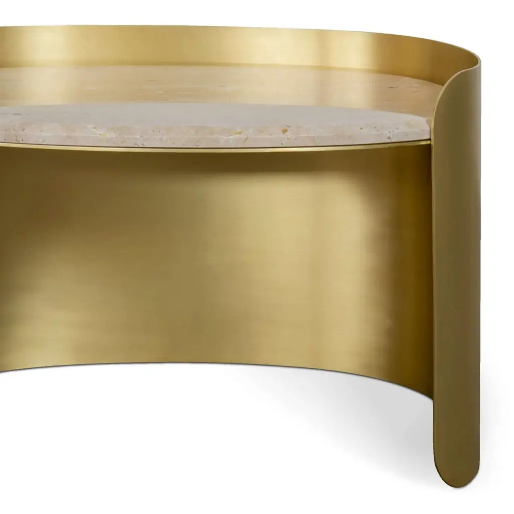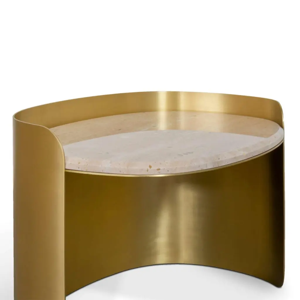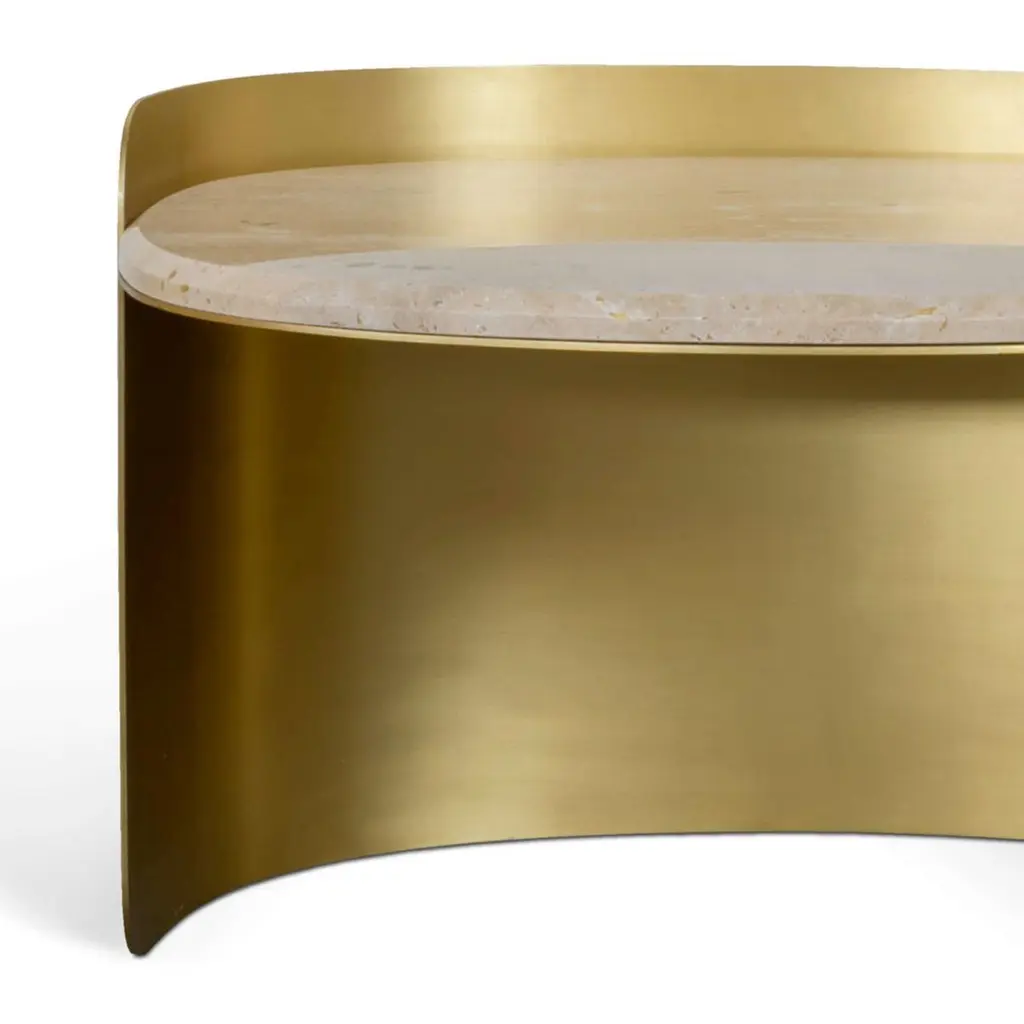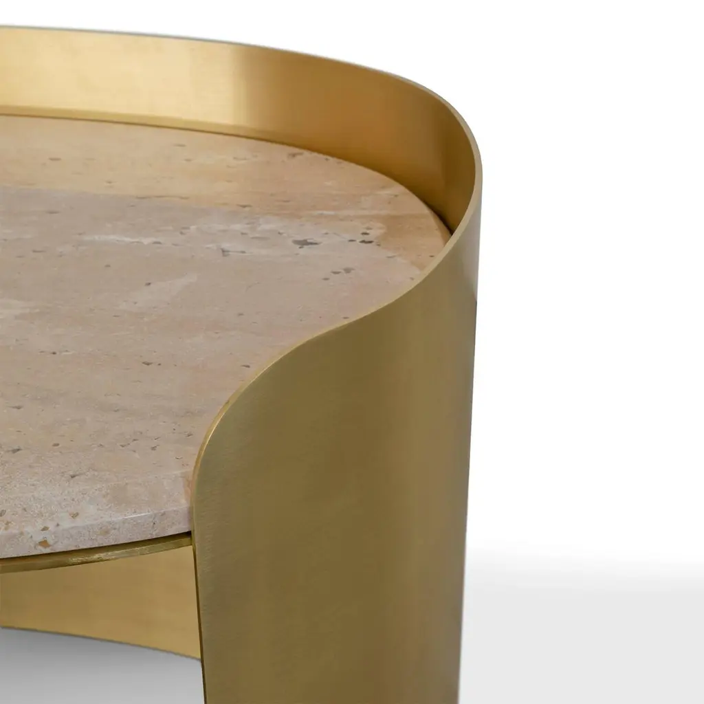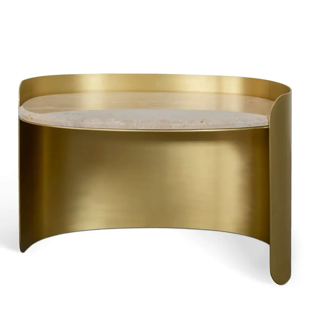 Side table curved brass oval with structurein solid brass in aged finish. With oval travertinestone top.