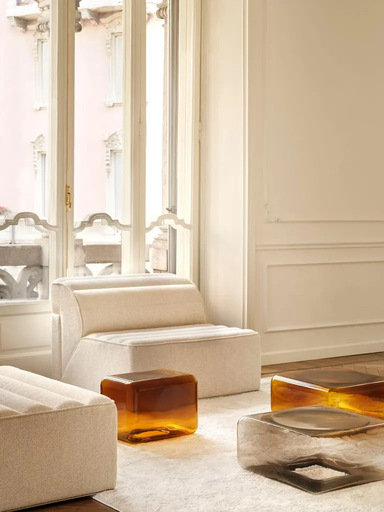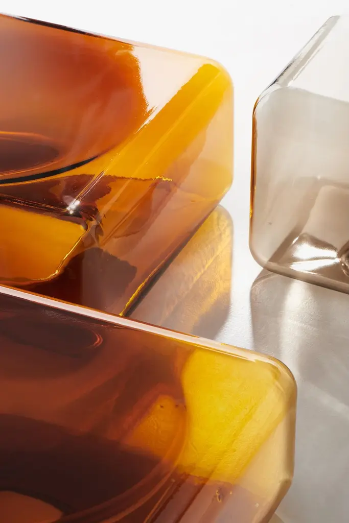 Matter, light and colour merge in an intense material interplay in the Lokum series of side tables, crafted by Sabine Marcelis for Acerbis. It is a collection that captures the sophistication of minimalist shapes, enhanced by the skilled craftsmanship of blown glass. Sabine Marcelis, known for her poetic and meticulous use of reflective surfaces and colour nuances, has fashioned a collection that radiates ethereal charm. This collection produces remarkable interplays of light and shade.Lokum is available in rectangular and square versions in amber and smoky hues providing extensive versatility for standalone pieces or in conjunction with other items for customised configurations. Lokum is the tangible result of the Dutch designer’s ability to transform materials into works of art.FinishesMade of blown glass coloured in a crucible. Available colours:smoked grey or amber.DimensionsL55 D55 H25; L45 D32 H32; L32 D32 H42 cm.