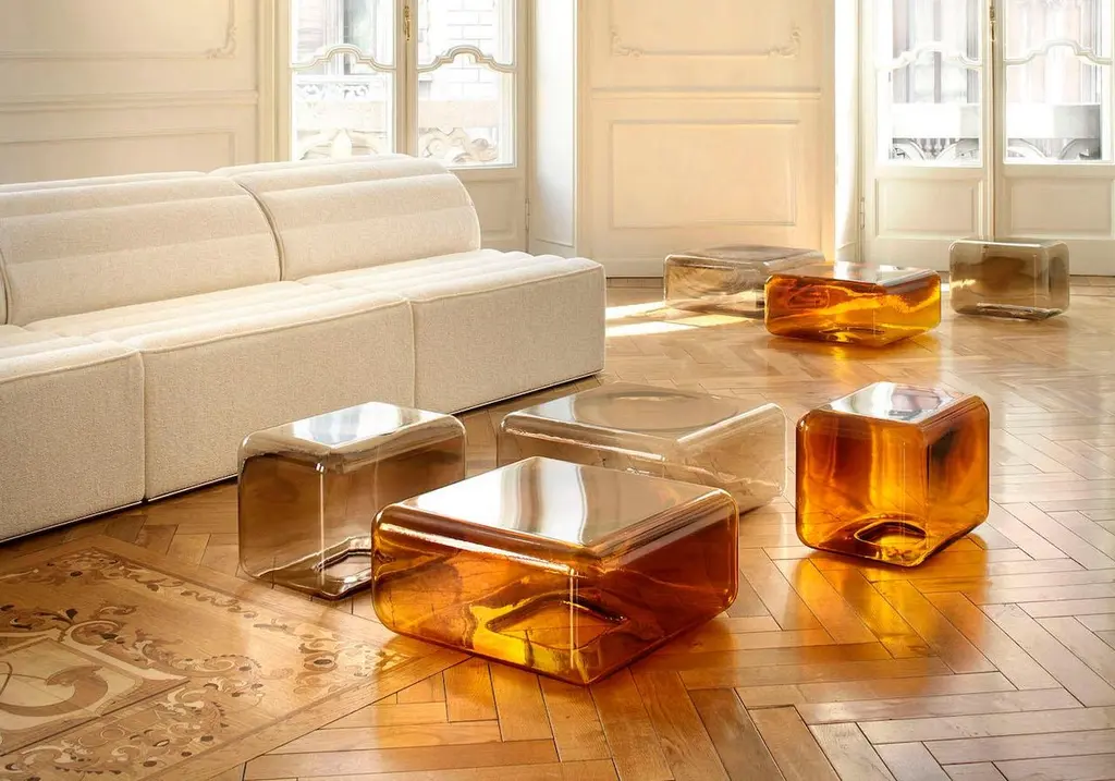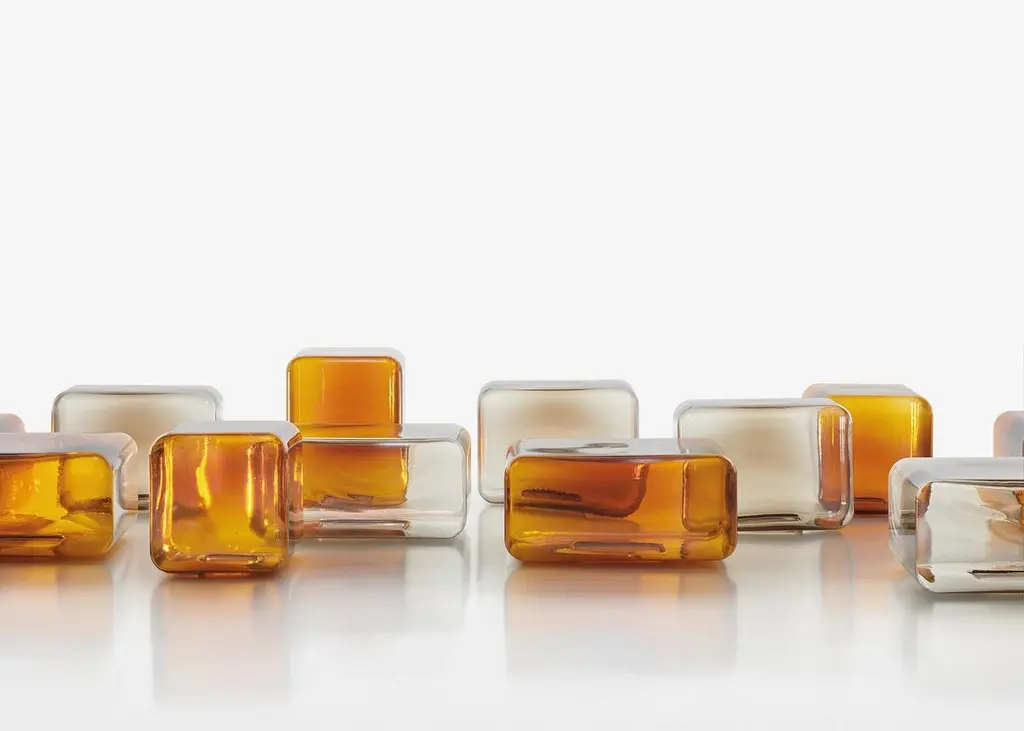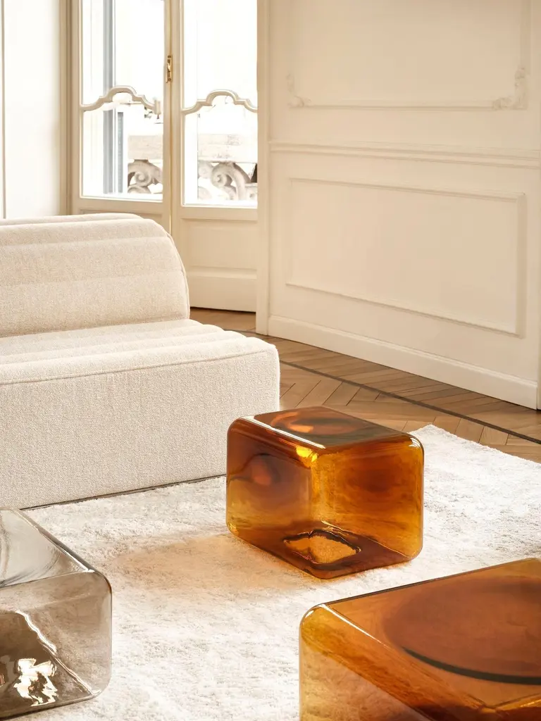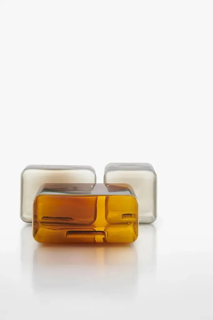 Matter, light and colour merge in an intense material interplay in the Lokum series of side tables, crafted by Sabine Marcelis for Acerbis. It is a collection that captures the sophistication of minimalist shapes, enhanced by the skilled craftsmanship of blown glass. Sabine Marcelis, known for her poetic and meticulous use of reflective surfaces and colour nuances, has fashioned a collection that radiates ethereal charm. This collection produces remarkable interplays of light and shade.Lokum is available in rectangular and square versions in amber and smoky hues providing extensive versatility for standalone pieces or in conjunction with other items for customised configurations. Lokum is the tangible result of the Dutch designer’s ability to transform materials into works of art.FinishesMade of blown glass coloured in a crucible. Available colours:smoked grey or amber.DimensionsL55 D55 H25; L45 D32 H32; L32 D32 H42 cm.