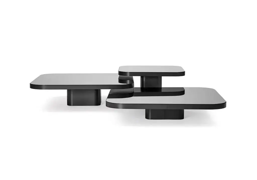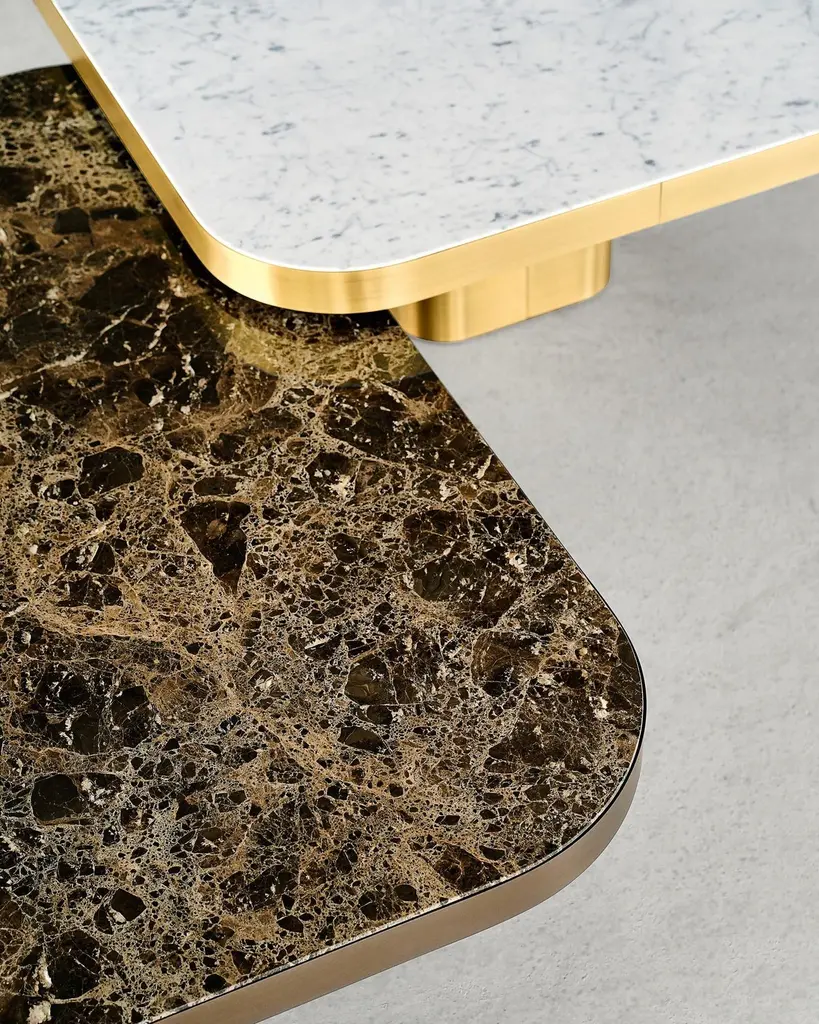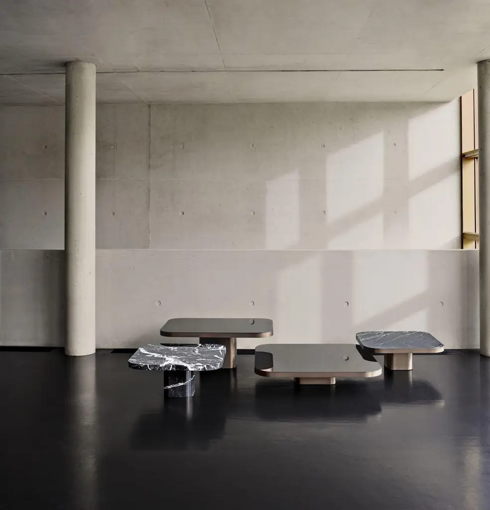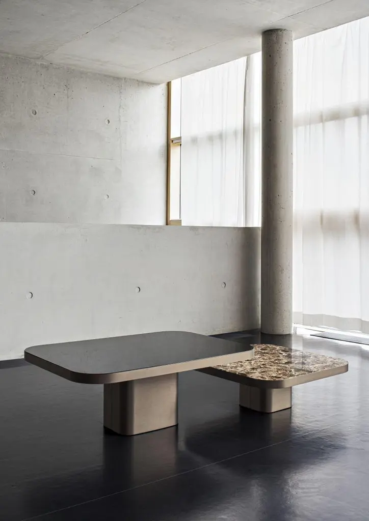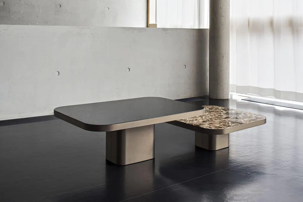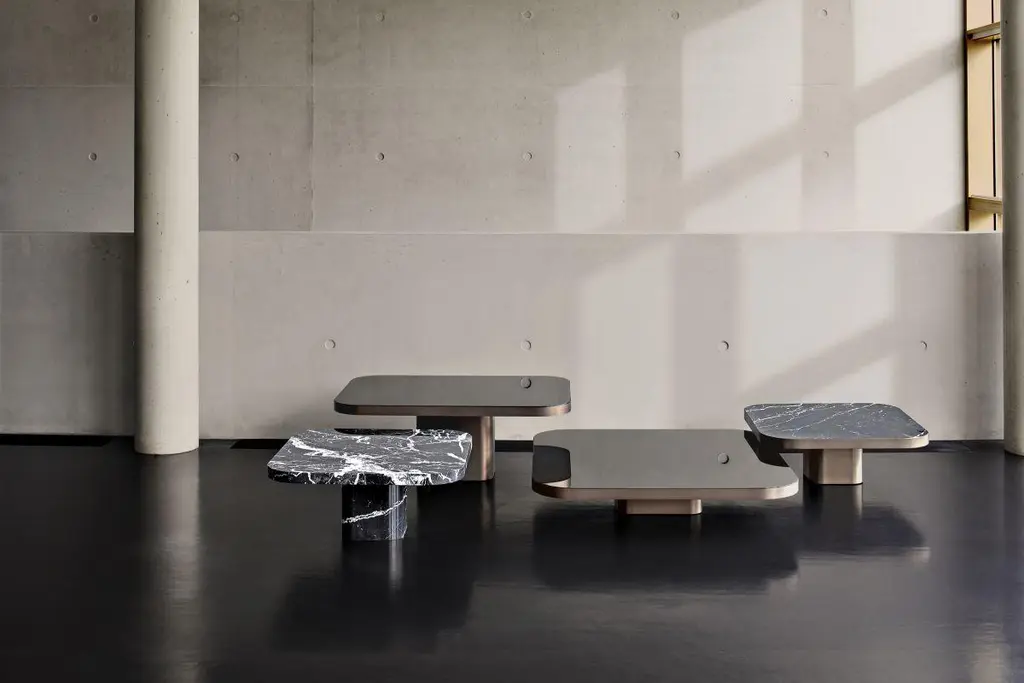 Bow Coffee Table No. 6Guilherme Torres, 2022Inspired by 1970s lines and designs, Brazilian Guilherme Torres presents a side table or coffee table of casual elegance. The metal-covered surface of the body also quotes futuristic designs of the era, but it is a clearly contemporary design. The glass or marble covered tabletop floats above a base with rounded edges. The table is available in five sizes. Combined in different heights, the tables can be arranged as a group with overlapping tabletops, resulting in a dynamic sculpture with a generous and multi-level storage surface.The ensemble is complemented by the Bow Coffee Table No. 3 Marble, completely made of white or black marble. Combined with the other sizes in brass, it establishes an interesting contrast of materials.