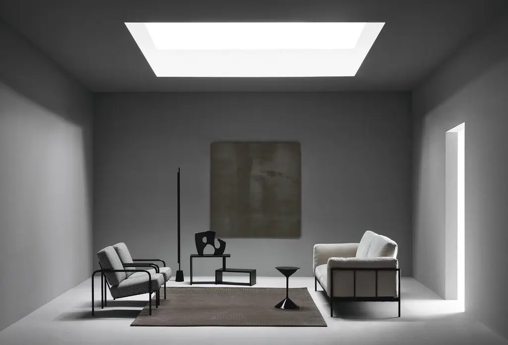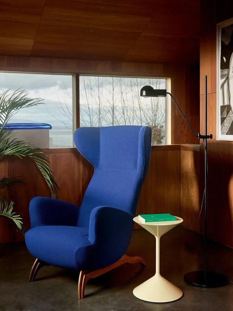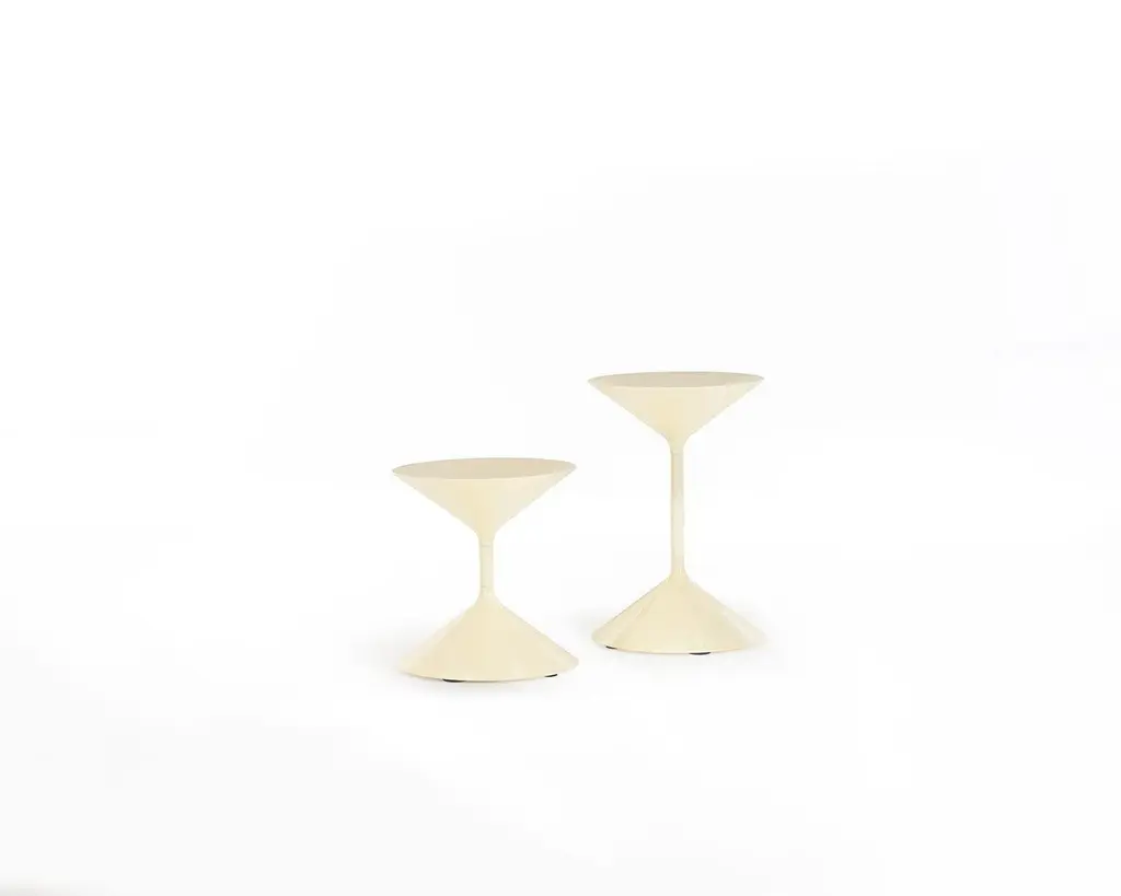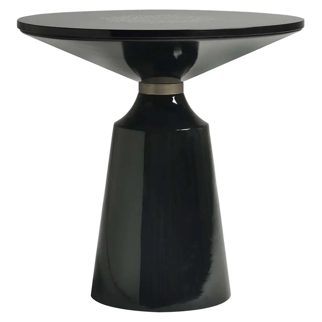 Small table - stand. Stiff polyurethane cones, steel stem, glossy lacquer in the colours talc, wax, lilac, hemp, caramel, orange, amaranth, grass green, espresso or black.His ‘time’ settles into clean shapes, through signs that possess the intrinsic force to survive well beyond the life of the artist, as the classics are destined to do.Thus two polyurethane cones, the ends of which are connected by a steel bar, acquire the definitive qualities to merit a fixed place in Tempo, a small, hourglass-shaped table, whose polished surface is ready to compliment any preexisting furniture.