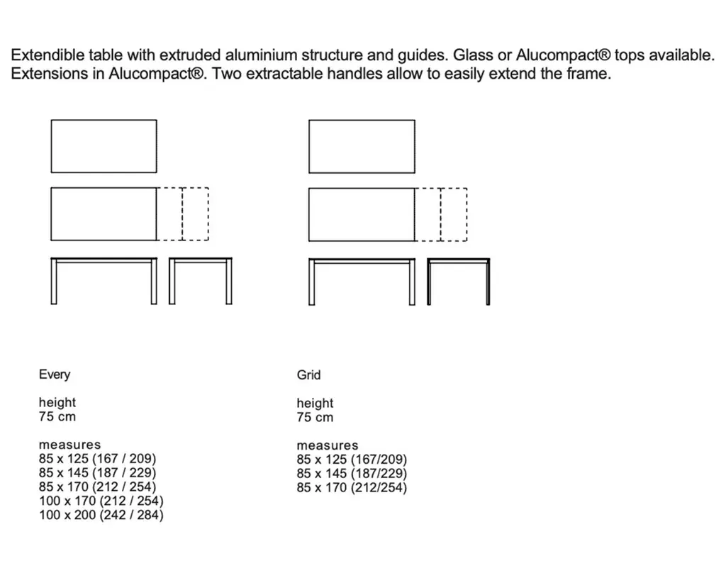 Every and gridCaronni + Bonanomi · 2009 / 2013Simple and practical. Every table maintains its versatility and joins grid, another extending table, in a perfect combination of functionality and beauty. Available in a wide range of materials, sizes and nishes, making them an attractive addition to any kind of setting.Simple, functional and essential the Every table shows all its versatility by proposing a wide range of materials, sizes and finishes, which enlarges the possibility of placing it in different enviroments.Two extractable handles allow to extend easily the die-cast structure. Extendible table with extruded aluminium structure and guides. Glass or Alucompact tops available. Extensions in Alucompact. Two extractable handles allow to easily extend the frame.