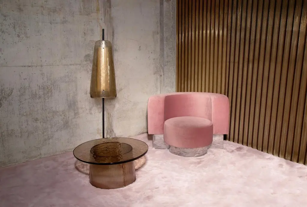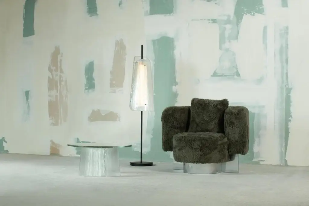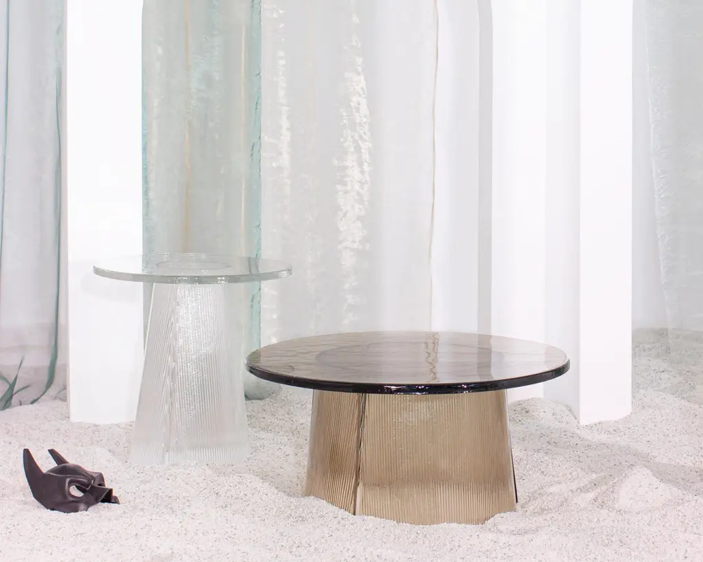 The bubbled surface of the cast glass table top dances against with the smooth lines of the fluted cast glass base. The bent side table expresses the beauty of glass in all its forms. With a striking simplicity, this interior companion has the ability to blend in or the centre of attention.Material: handmade glassColourtransparent, grey