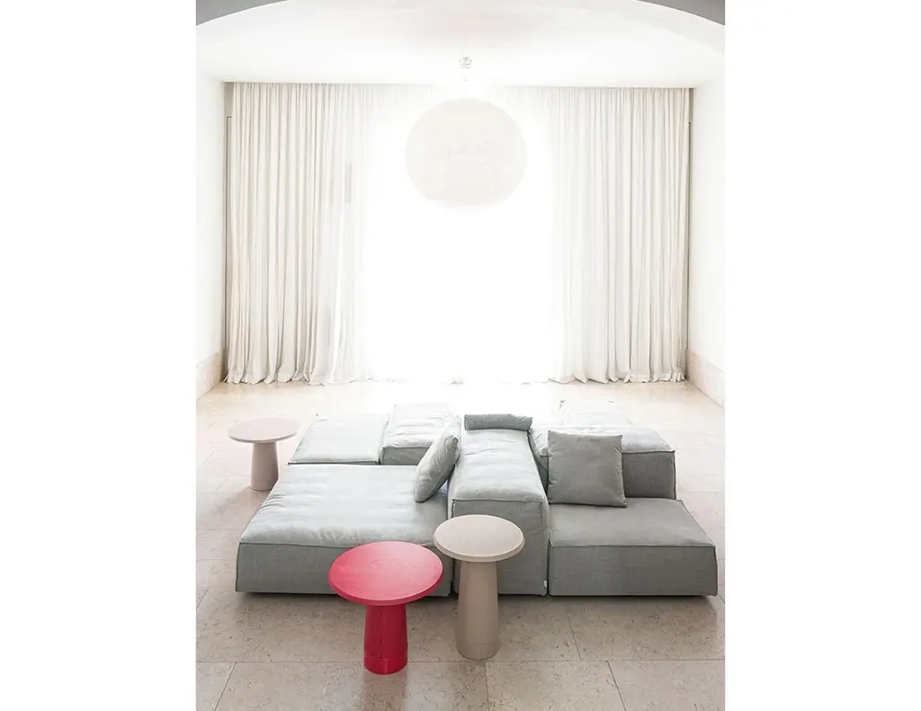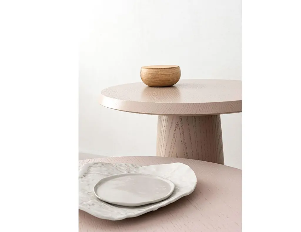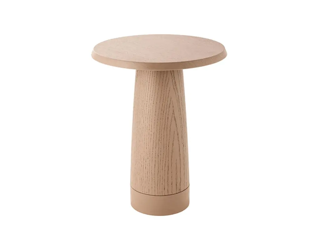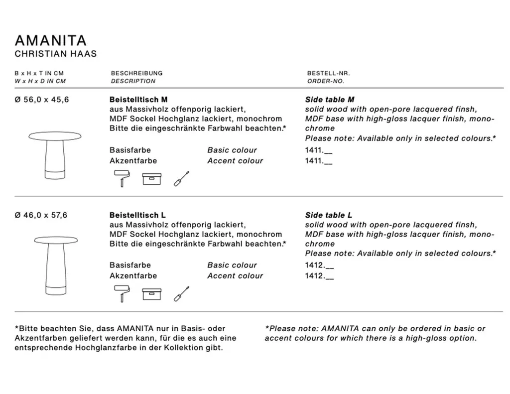 The AMANITA side table combines contemporary clarity with a surprising sense of familiarity. It’s down to the natural elegance of its mushroom-like form. The tabletop and the upper section of the foot are both made of solid wood, with an open-pore, matte lacquered finish. This makes for a subtle contrast to the same-colored high-gloss finish of the lower section. The subdued sheen of the foot complements the visual unity of the horizontal and vertical surfaces perfectly. With a range of colors to choose from, it’s easy to give AMANITA a personal touch. The table comes in two sizes with different diameters and heights, making it even more practical and versatile as an accessory. AMANITA works well in living spaces but also in offices and hotels. A side table that breathes life into any setting.