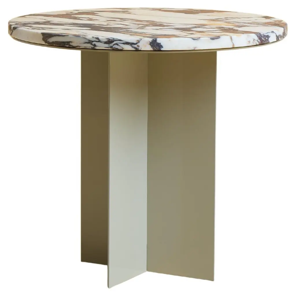 Side Table Cylia with base structure in solid aluminium in antique brass finish and with white and grey polished marble round top.