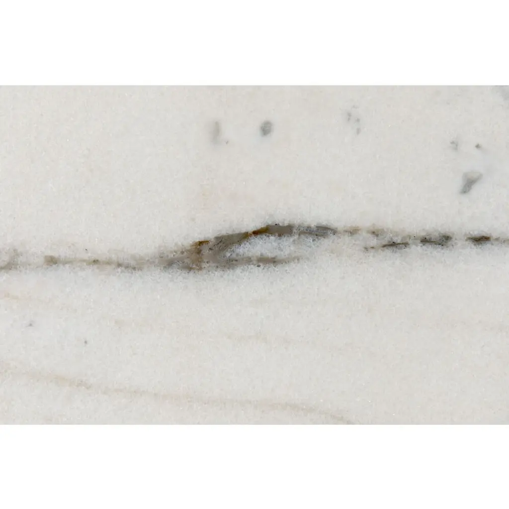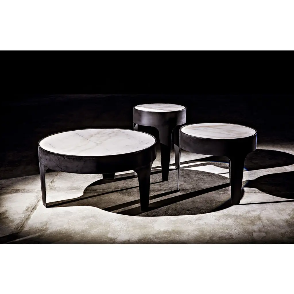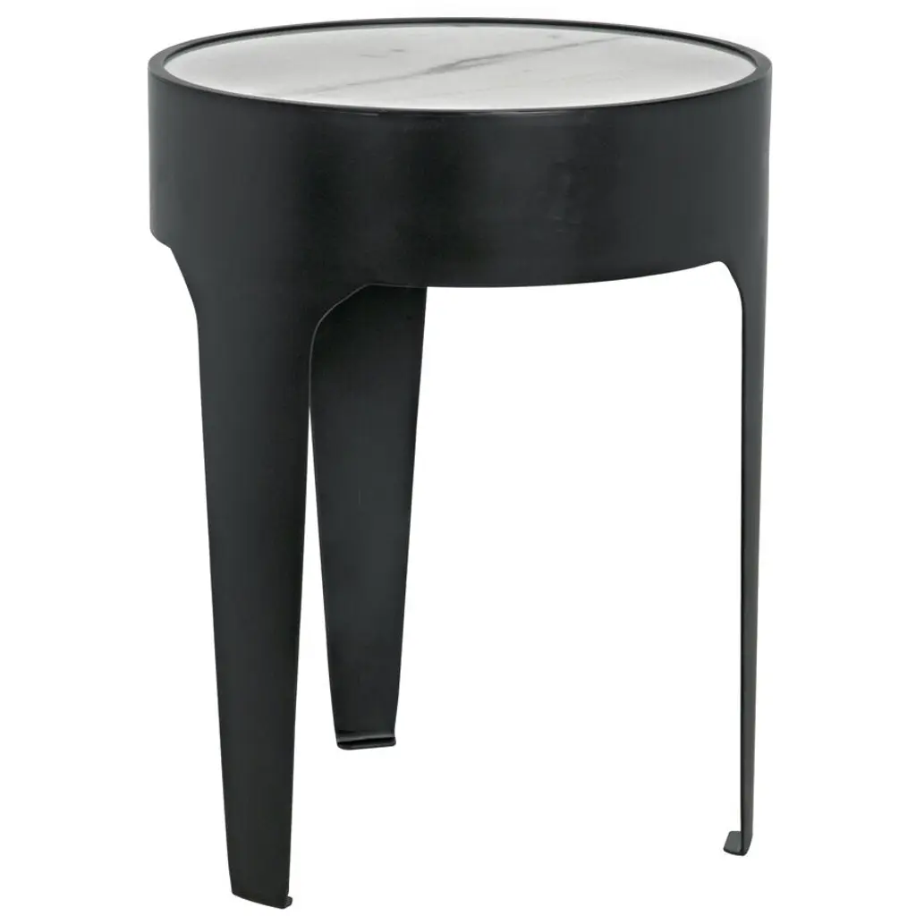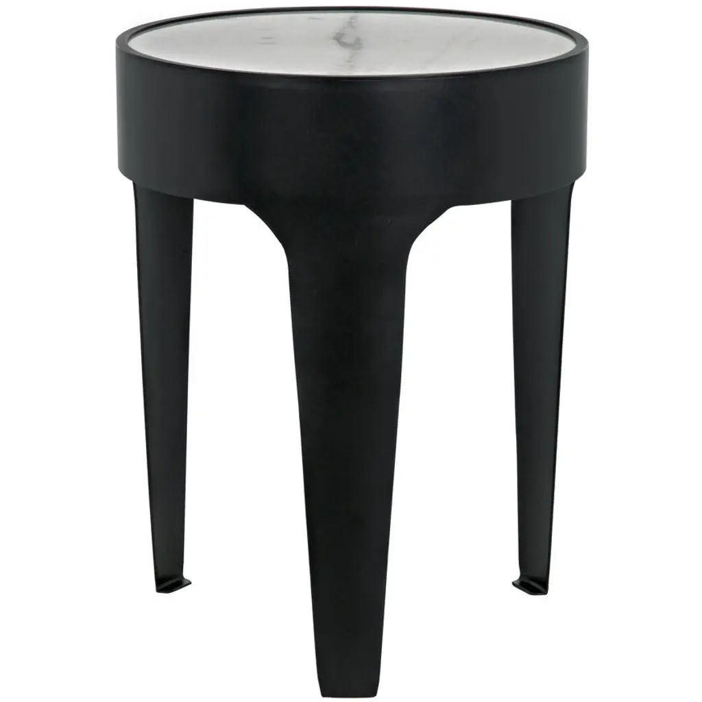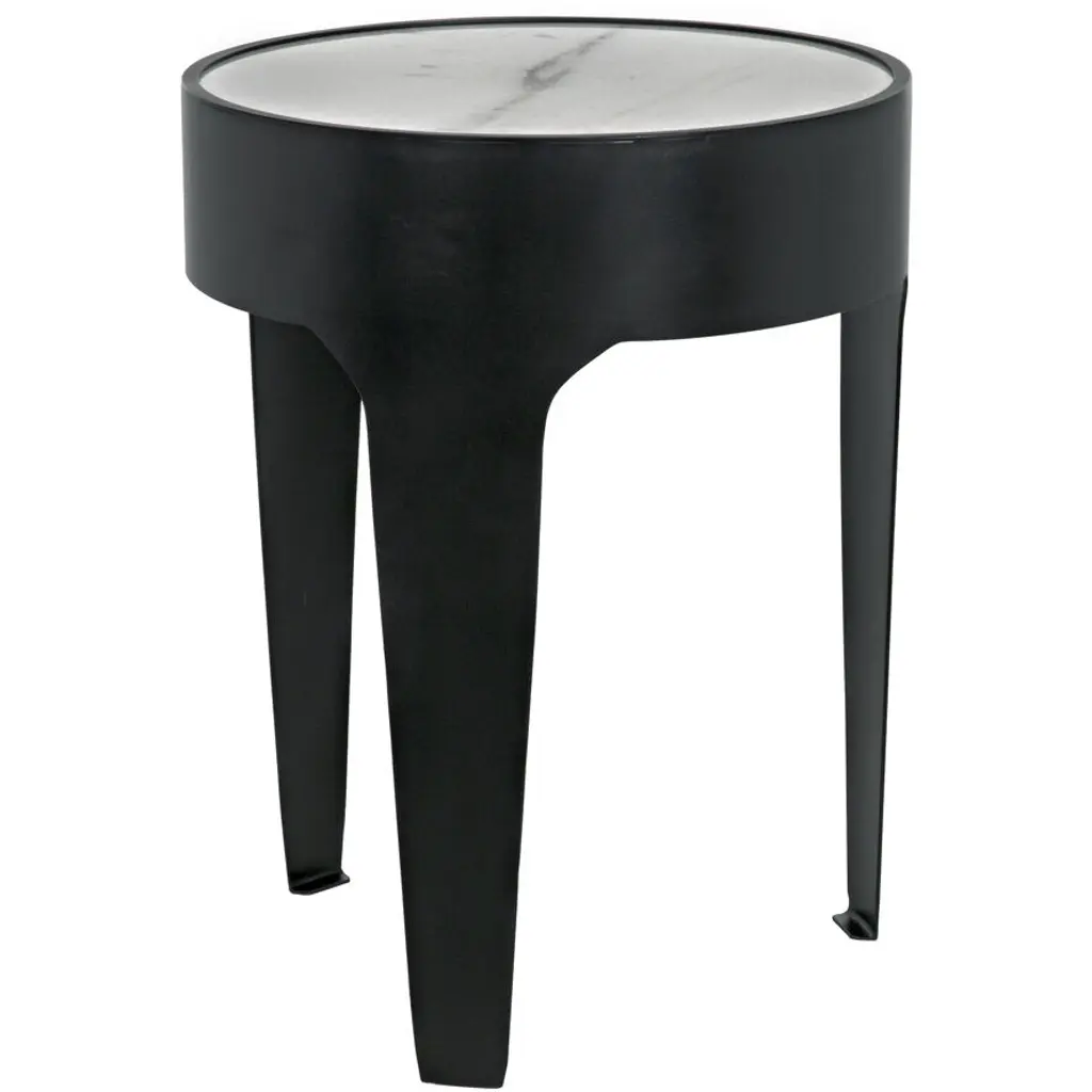 A circle of natural white marble is held aloft by a thick band of minimally finished metal in this simple, yet stunning, round accent table. No two pieces of stone, and therefore no two tables, will be identical.