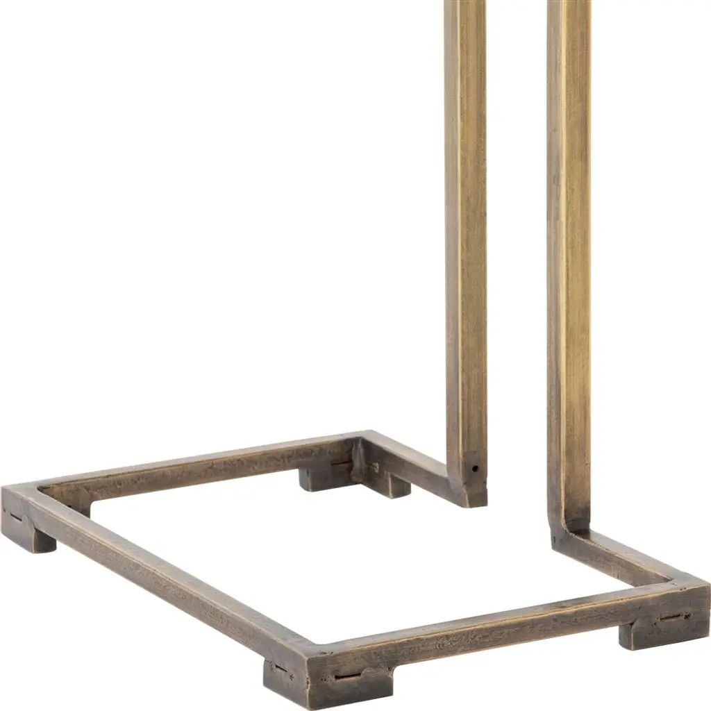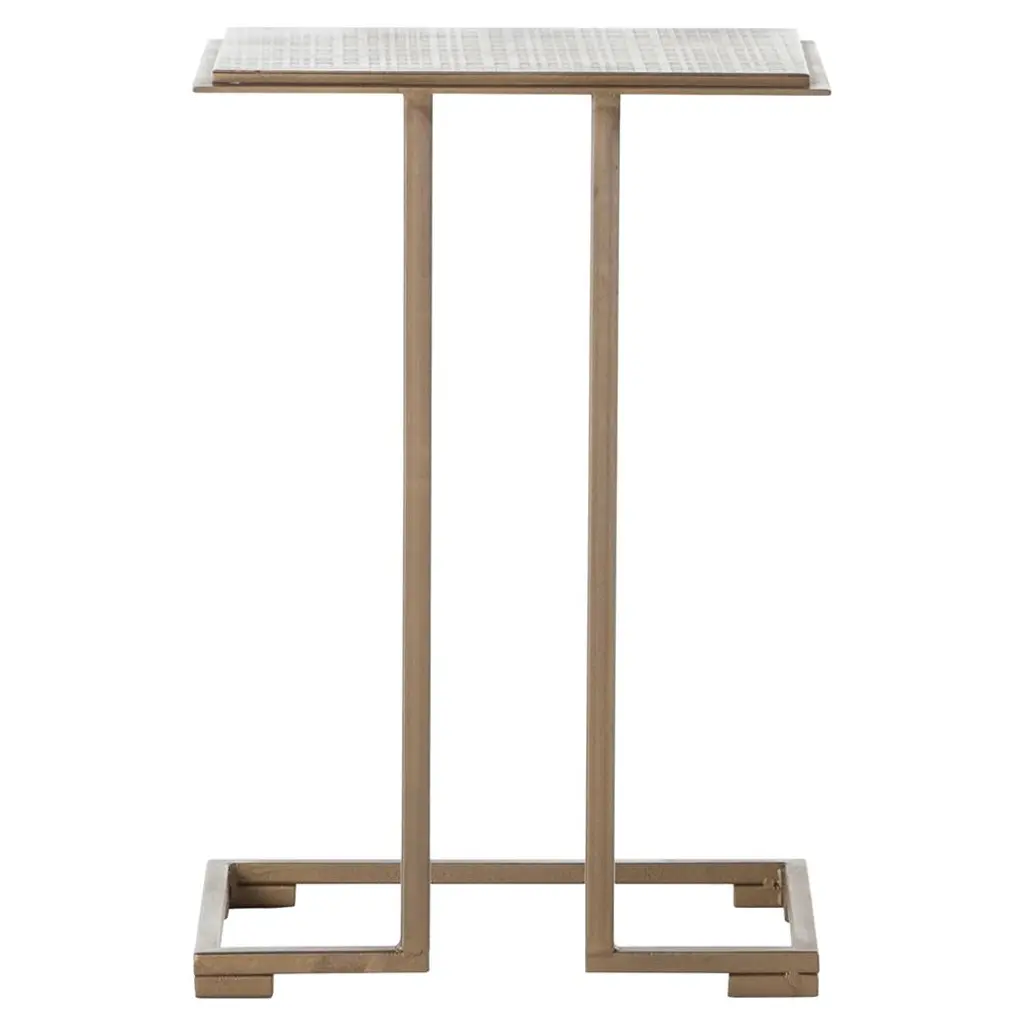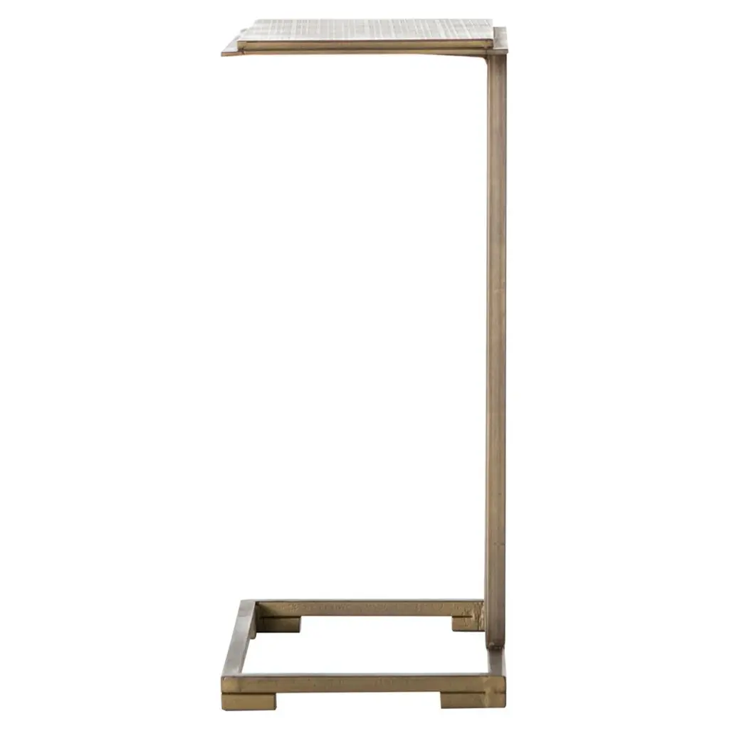 The artful Damian end table features a classic C shape and intricate acid etched detailing. Finished in antique brass, this lustrous iron accent piece brings a modern industrial touch to your living room, den, or bedroom.