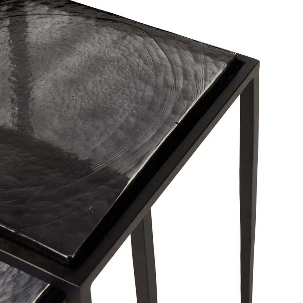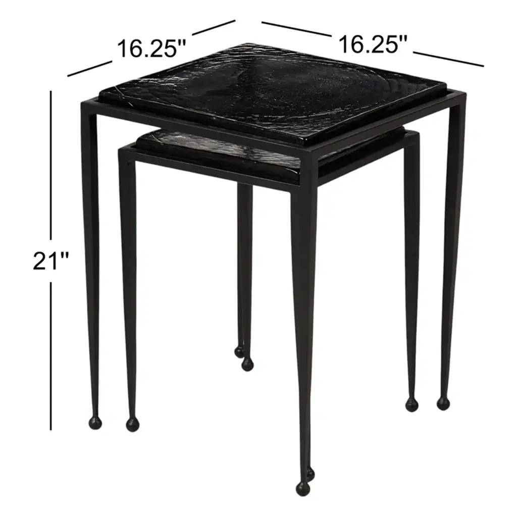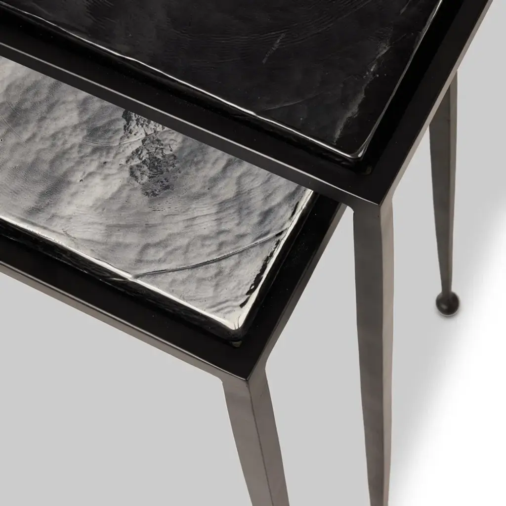 Slim, airy bases of black-finished iron support two varied-height nesting tables of smoked black glass. Designed to bunch or pull apart as desired, with ease.