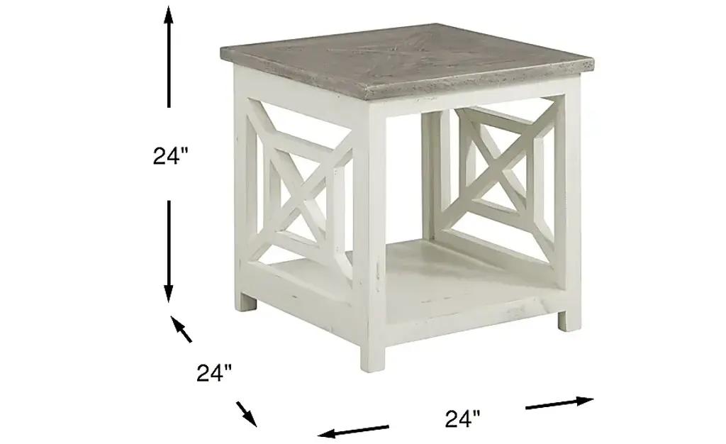 The Danusa end table set combines transitional styling with rustic elements for charming accents. Each table has a farmhouse-inspired look, crafted with a natural gray-finished top and a distressed white base. Along with two-tone color, it displays a decorative motif on each end above the lower shelf.