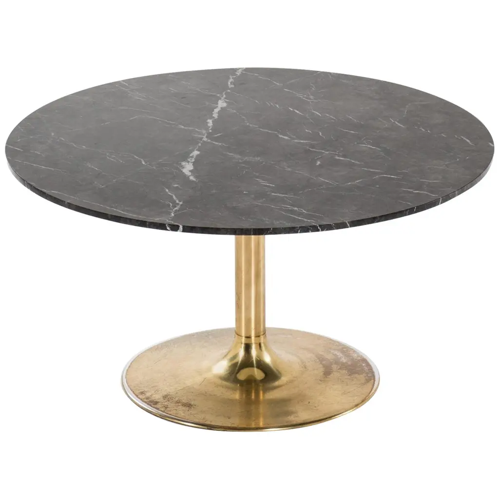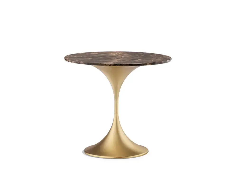 Playfully reminiscent of the Diabolo game with its fluid archetypal silhouette, this side table was inspired in its versatility by a half-wizard and half-devil character from "The Takes of Hoffmann". Its contemporary character combines with an exquisitely luxurious aesthetic owed to the round Verde Alpi marble top and the trumpet base offered in a stylish satin golden finish.