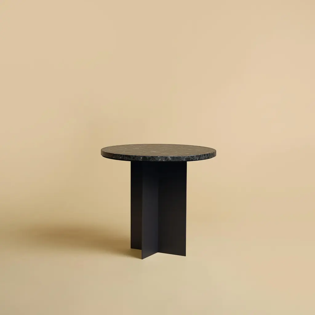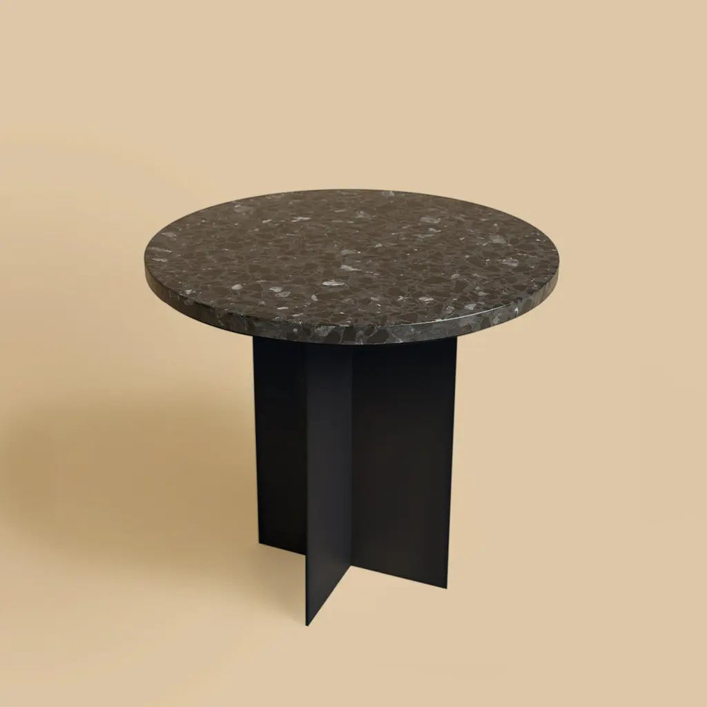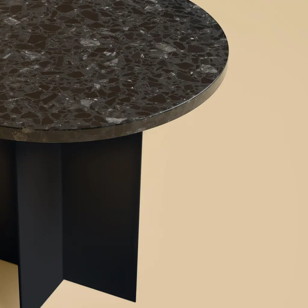 The Baker coffee table is produced with a powder-coated metal base and a top in terrazzo Mystery dark grey. The top is dark grey color and circular and has a diameter of 45cm, while the base is obtained by gluing black metal plates perpendicular to each other.Enhance your living space with the Baker Side Table, crafted from stunning Terrazzo and sleek metal legs. This elegant dark side table combines bold, natural stone with modern metal accents, creating a chic and versatile piece that complements any decor. Perfect for adding a touch of luxury to your bedroom, living room, or office, the Baker Side Table offers both style and durability, making it an essential addition to your home.The piece is designed by Lebanto and is Made in Italy in small familiar workshop. Attention to details and superior material is what distinguish Lebanto products.
