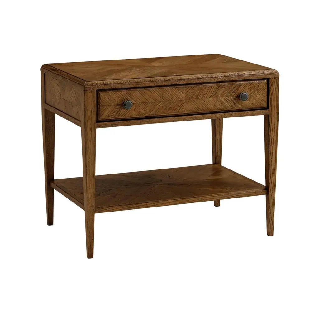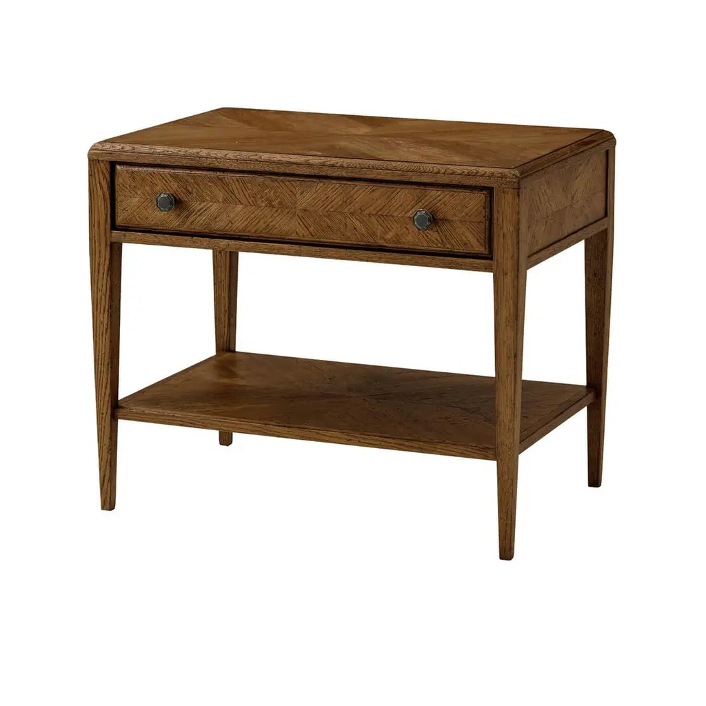 A dark rustic oak end table with oak parquetry patterned top and bottom tier, highlighted by our Dusk finish and joined with a rustic tapered oak leg.Shown in Dusk FinishDimensions29" W x 19.5" D x 24" H.