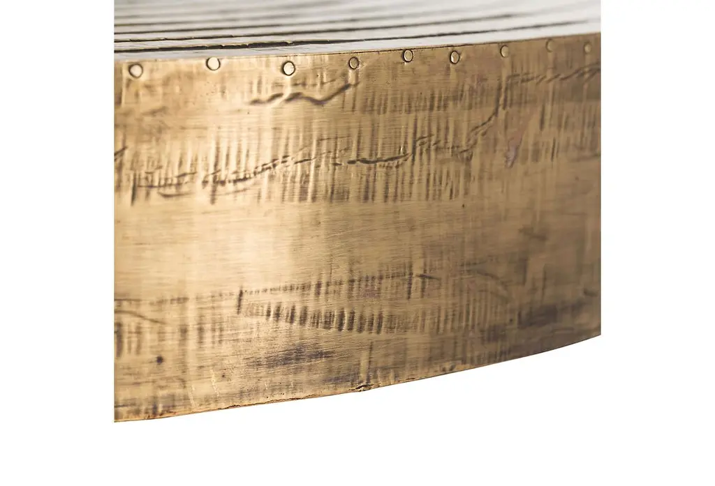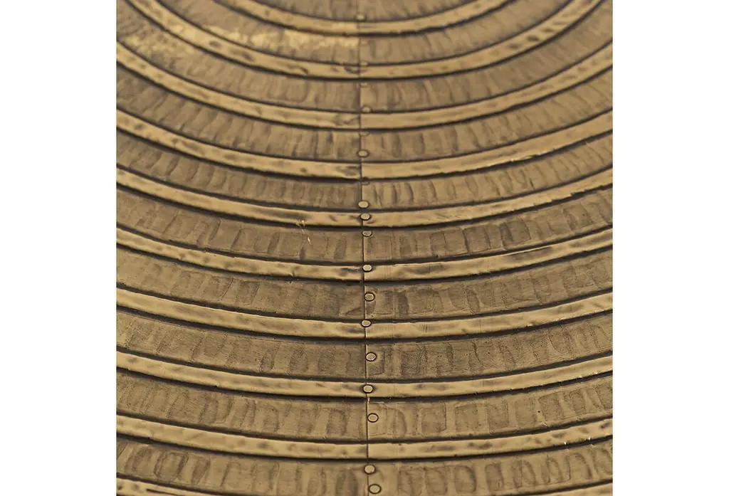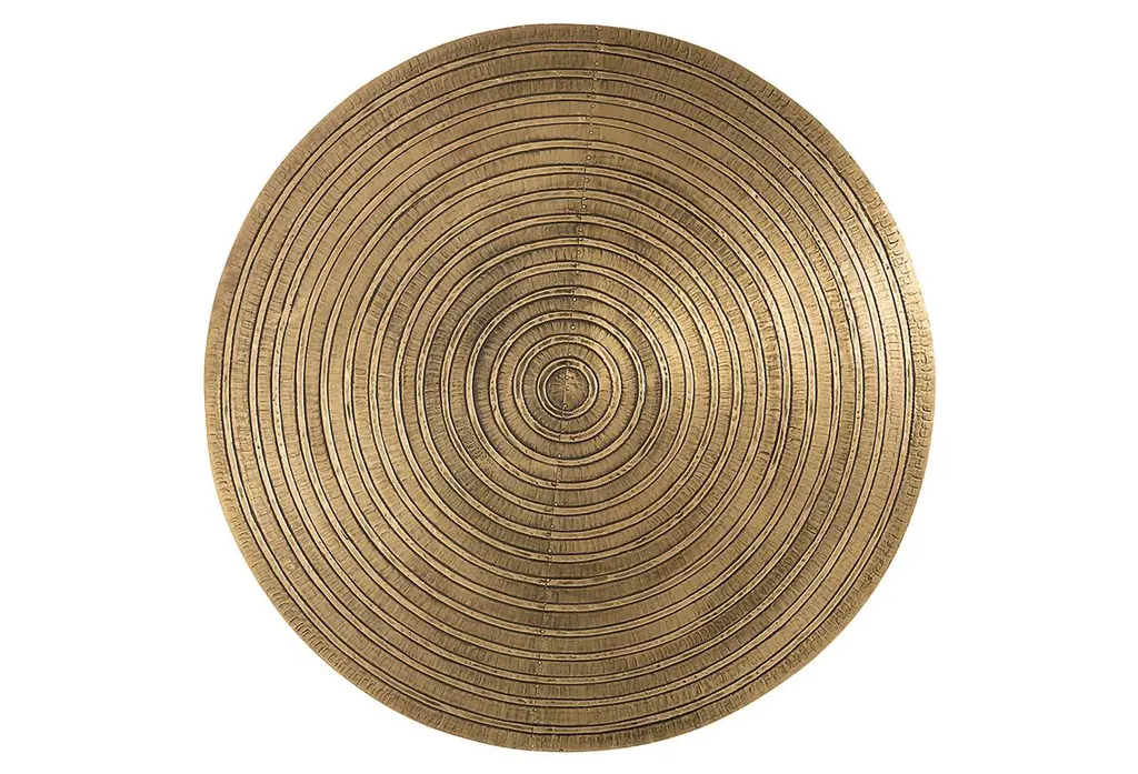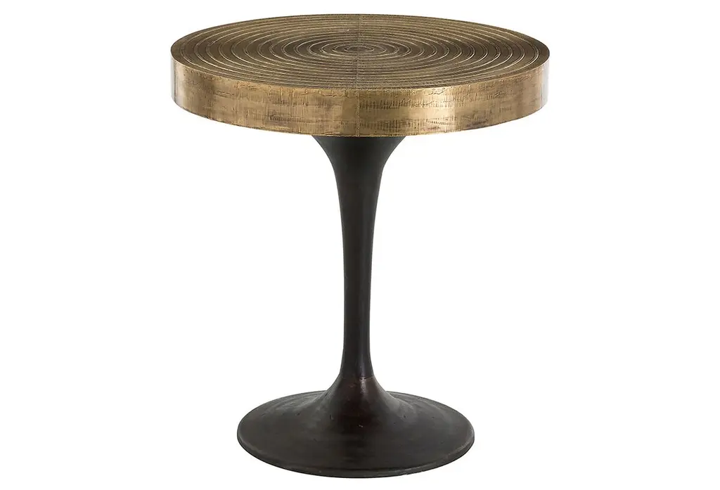 At home in a variety of decors, this side table features a subtly tapered body and masterfully carved top that's clad in antiqued brass with a concentric ring design. The finish of the top may vary, adding to the artisanal allure of the piece.