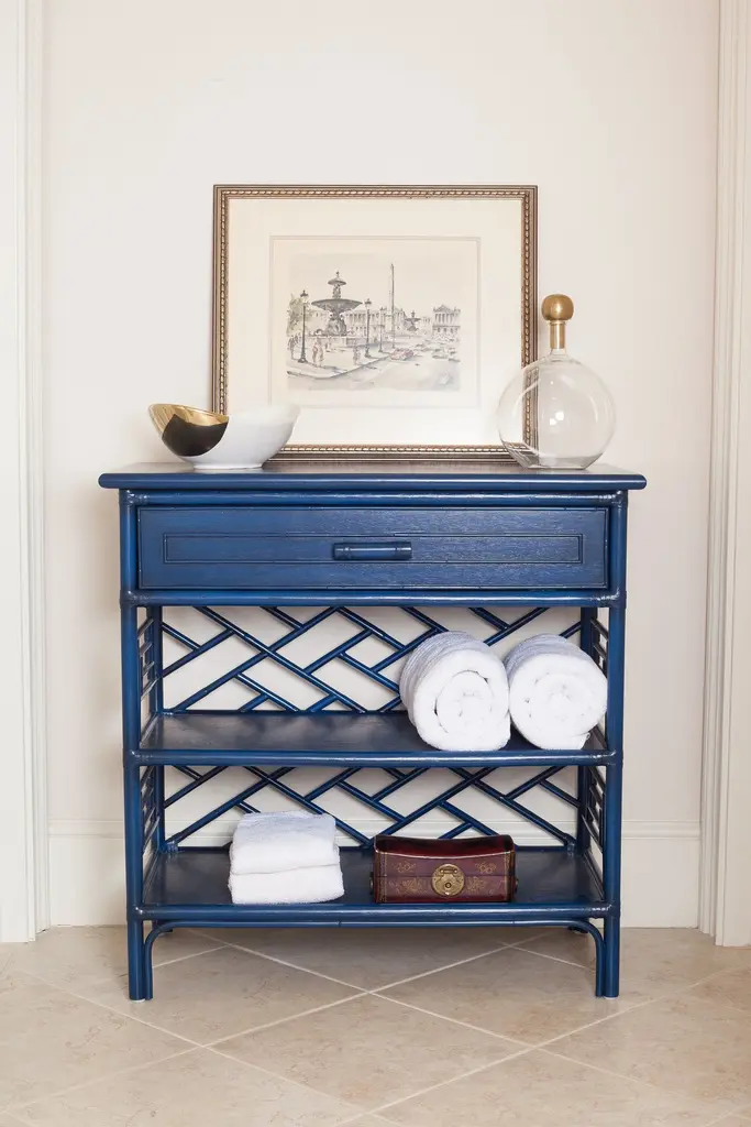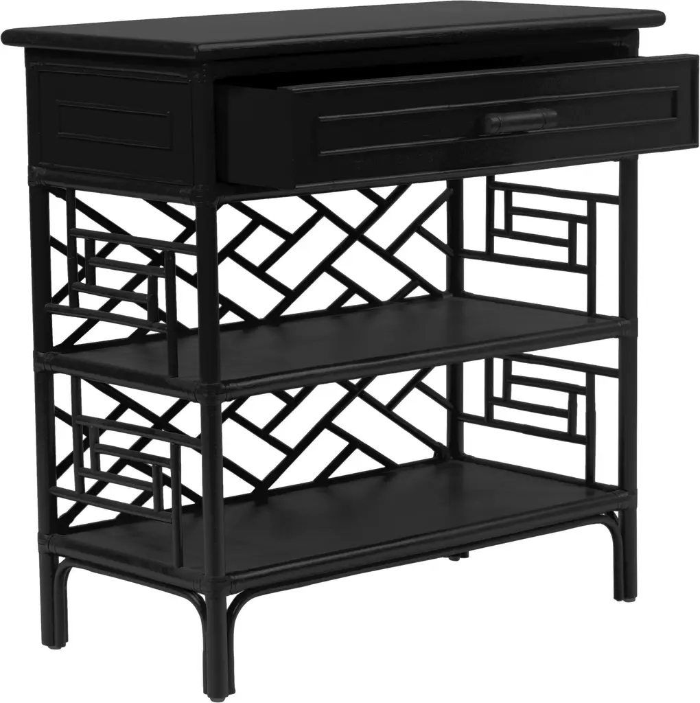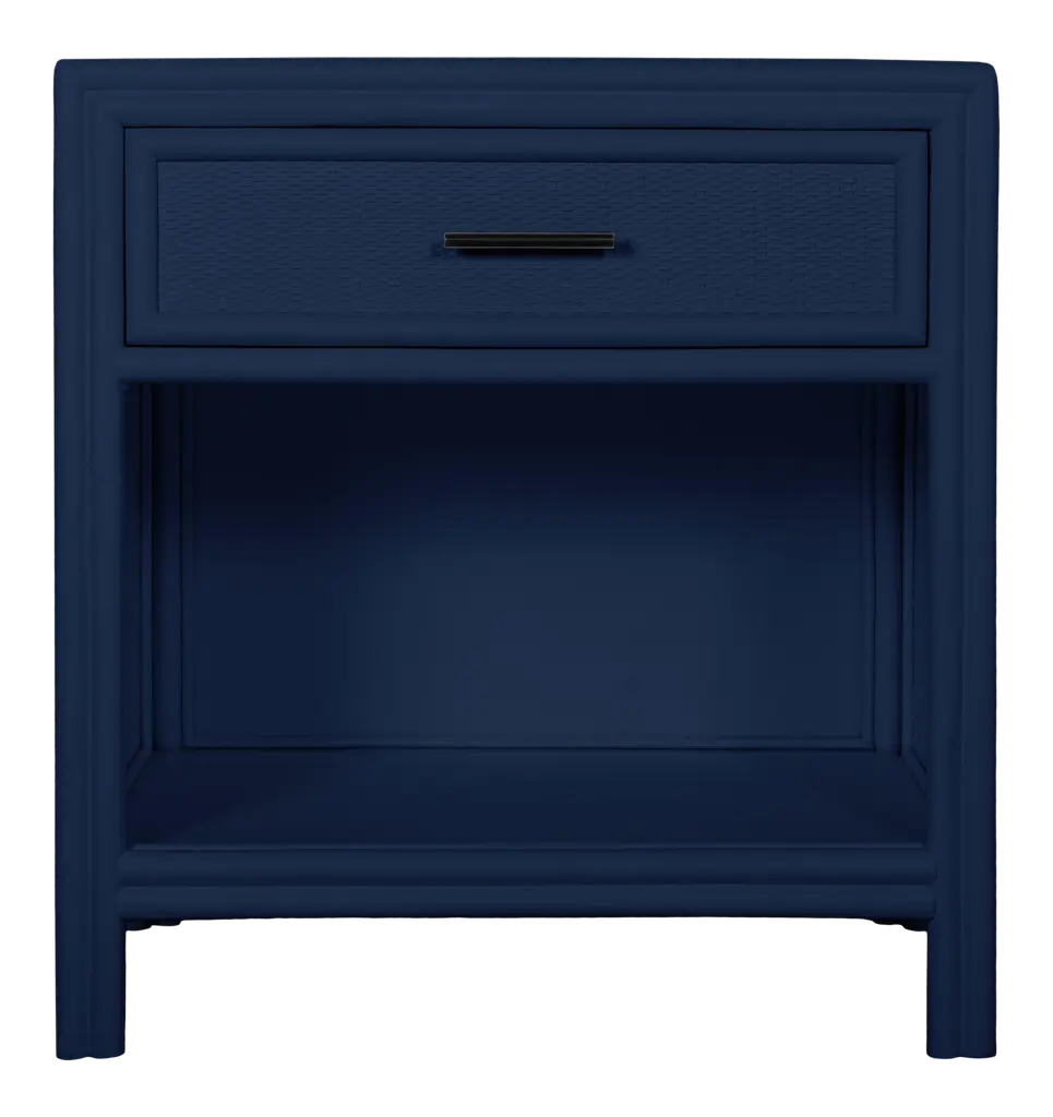 Showcasing a stunning Chippendale-style design, this nightstand or end table is crafted of rattan with rawhide bindings for added strength and textural contrast. Its two plywood shelves and single drawer offer a wealth of space for bedside storage.