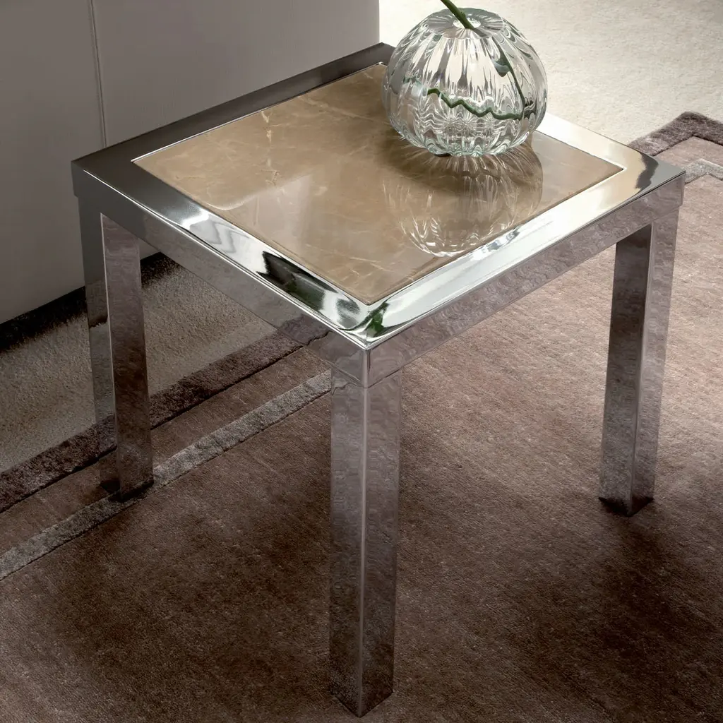 Square end table in chrome stainless steel and marble’s top with high gloss polyester finish. Top available in four different marbles upon request.