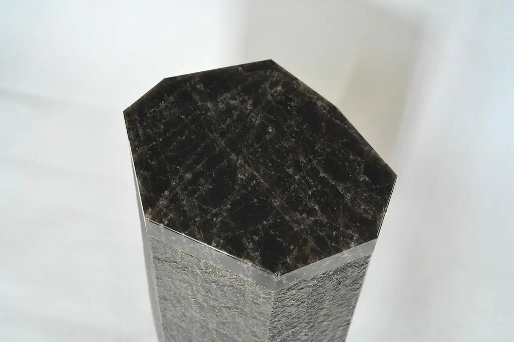 Elegant form rock crystal side table created by Phoenix Gallery, NYC. Hammered antique brass base with dark smoky rock crystal quartz top.Custom size and finish upon request.