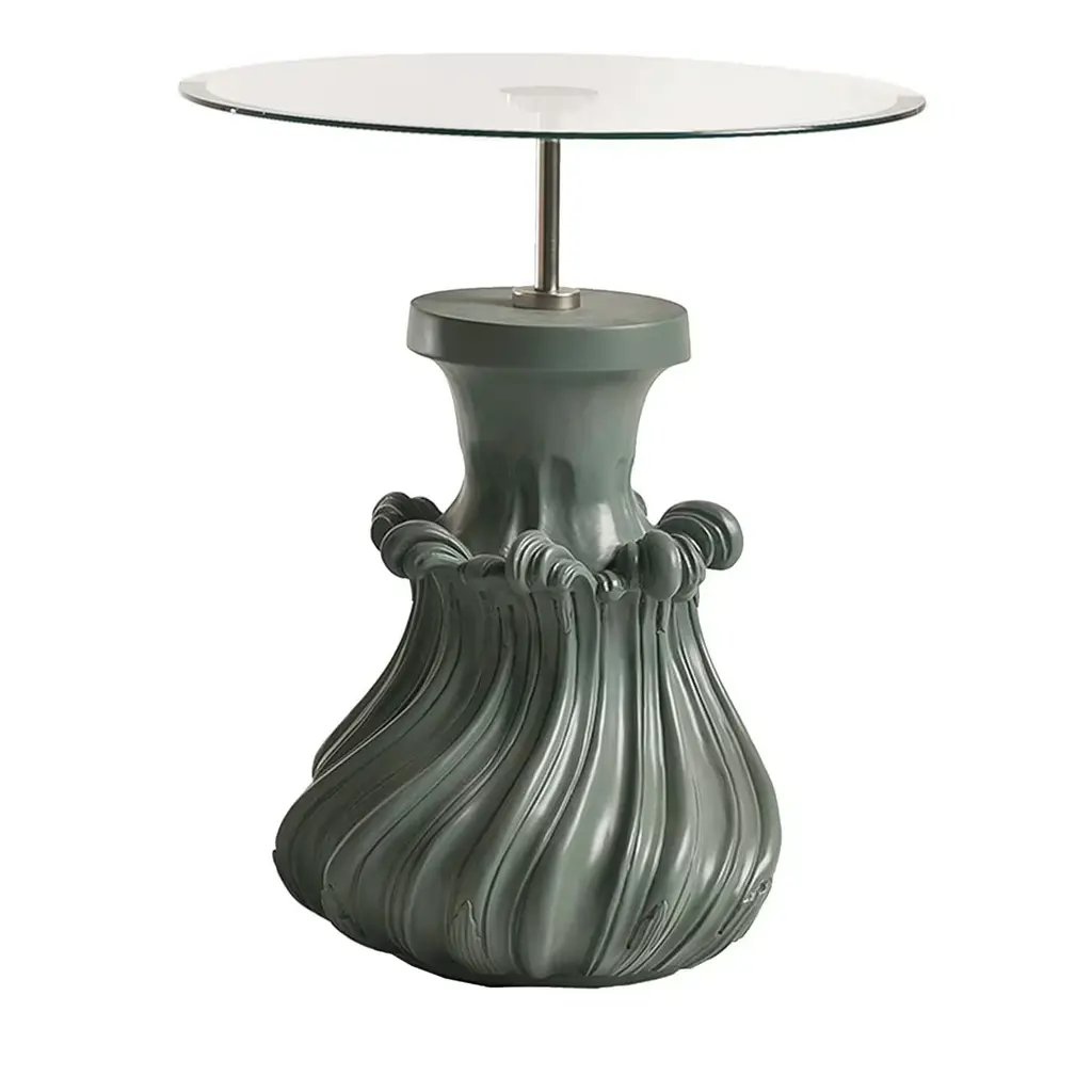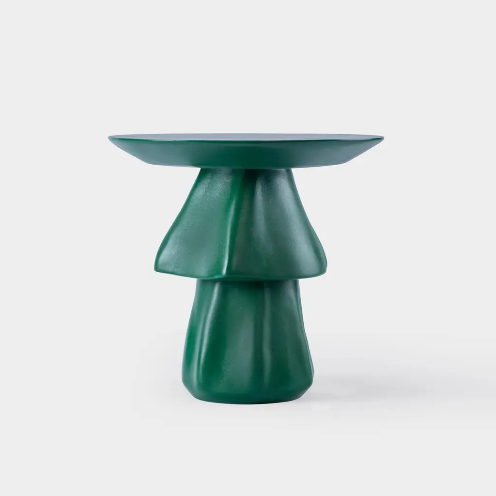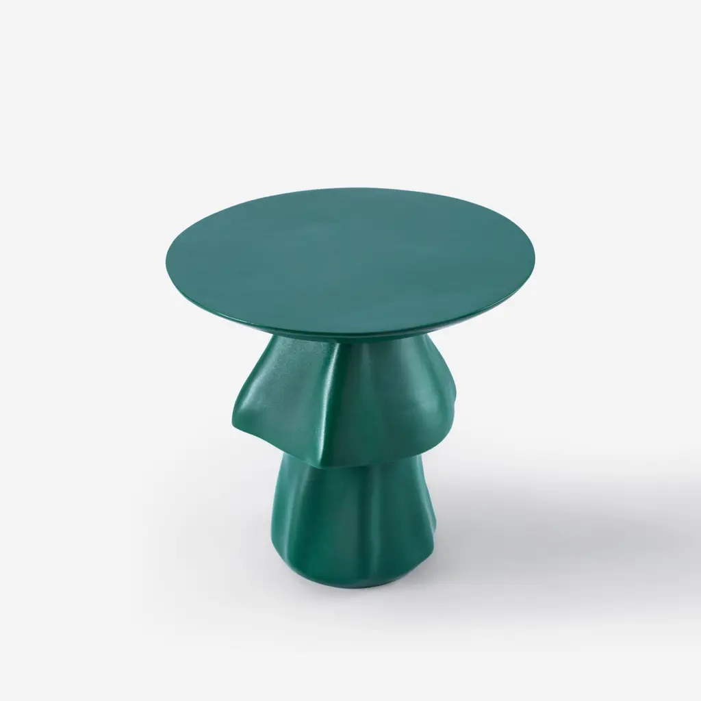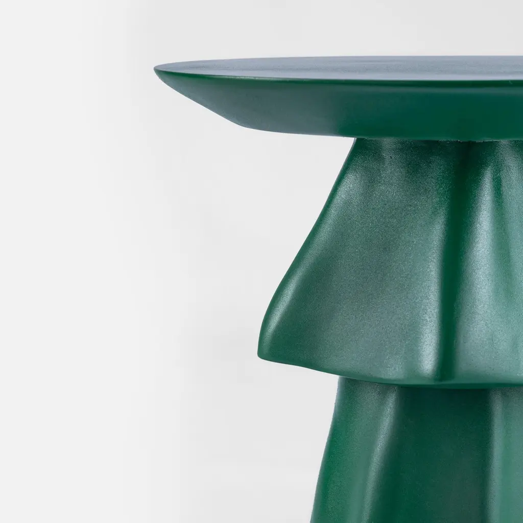 Deep green weather-resistant fiberglass outdoor side table - TanouraThis cascading accent table resembles the Tanoura costume and dance of Upper Egypt. The multilayered weighted skirt of the Tanoura fans out like flower pedals as the dancers twirl, giving the impression its about to jet up to the skies in a flight of fantasy. This design looks beautiful in any color and can be customized accordingly. Withstands all outdoor conditions. Color can be customized to suit your space.