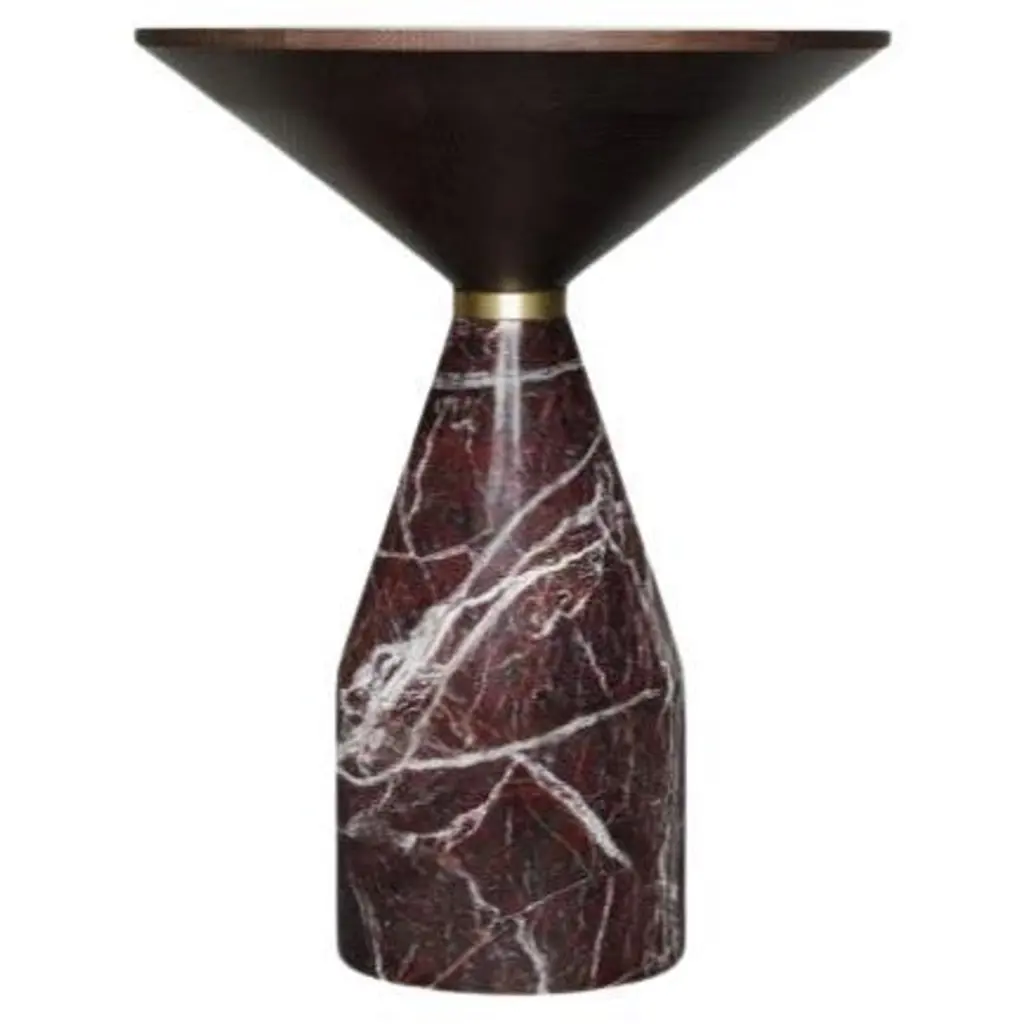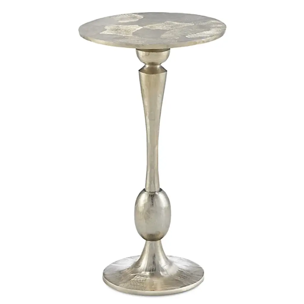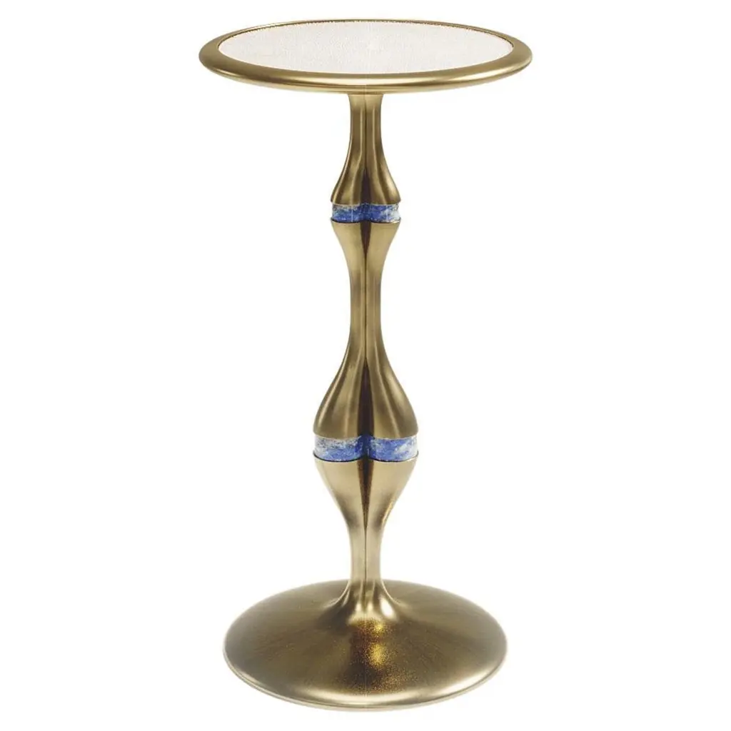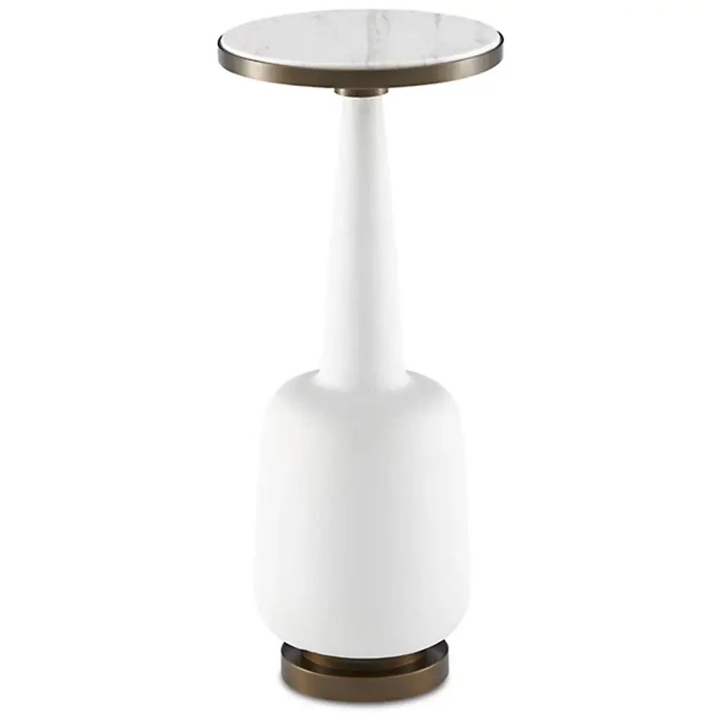 The Delphi Side Table possesses a statuesque quality that makes it a standout in any interior space. Crafted from enameled metal, the body features an ovate shape in a lustrous ivory hue. A squared base of brass in an antiqued finish features a textured cuff with sporadic lines, mimicked at the neck below a matching tabletop featuring textural striated patterns.