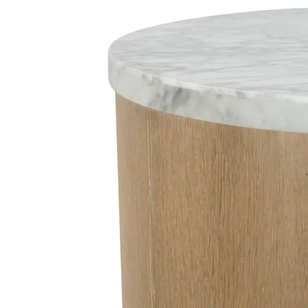 The Delray Round End Table from Rowe Furniture applies rustic modern principles to marble and wood materials in a compact format. Made in the USA, its drum base maximizes stability while conserving floor space. Each marble top tells its own geological story and is sealed for protection against daily use. The intentionally visible seams highlight the natural material qualities. This end table’s scale suits intimate seating arrangements while maintaining visual balance with larger furniture pieces.