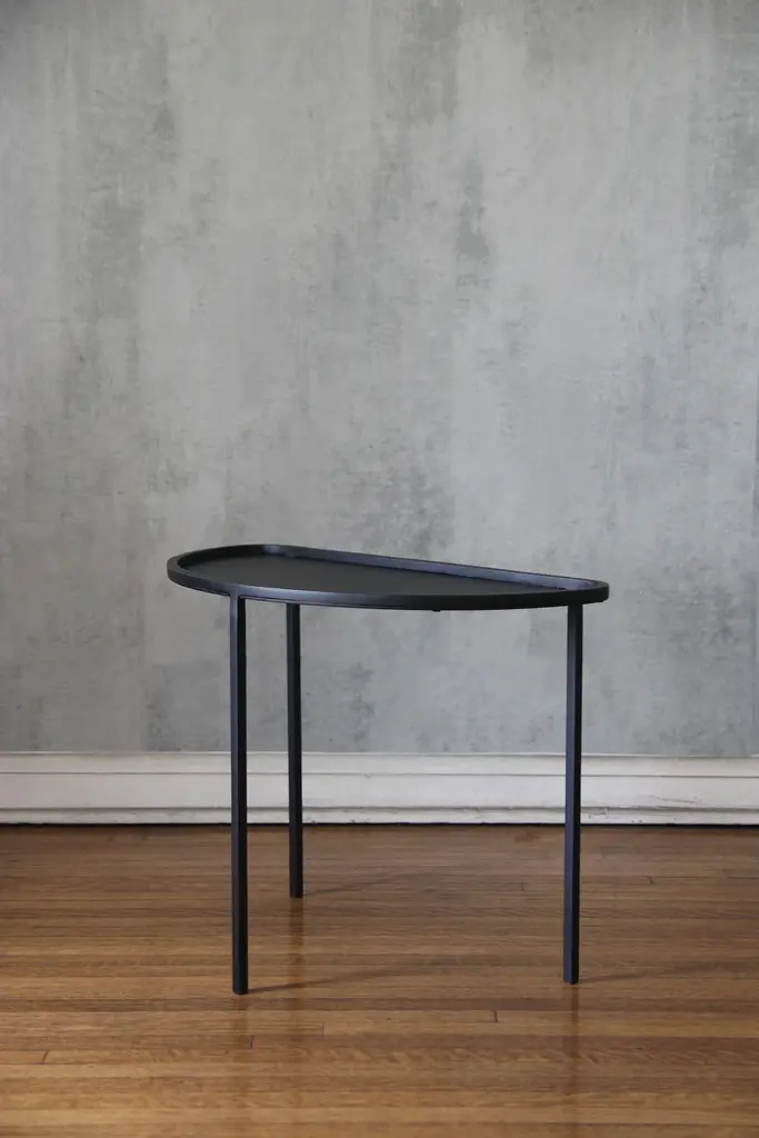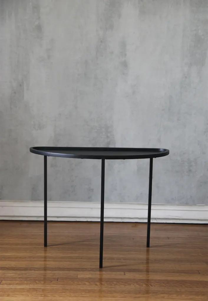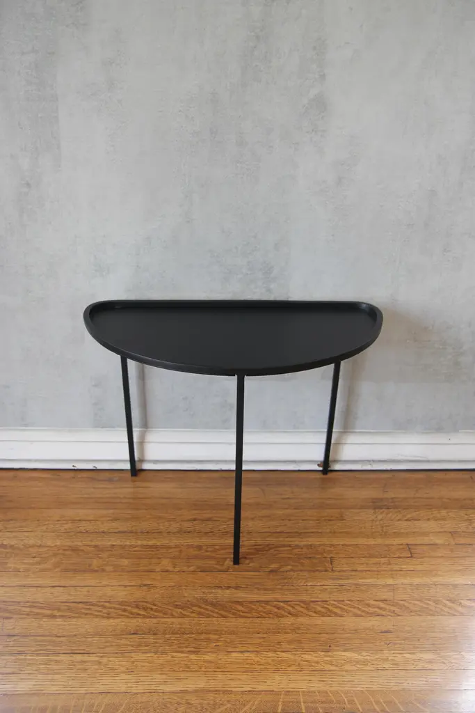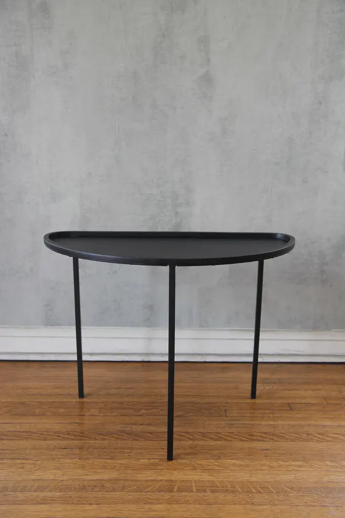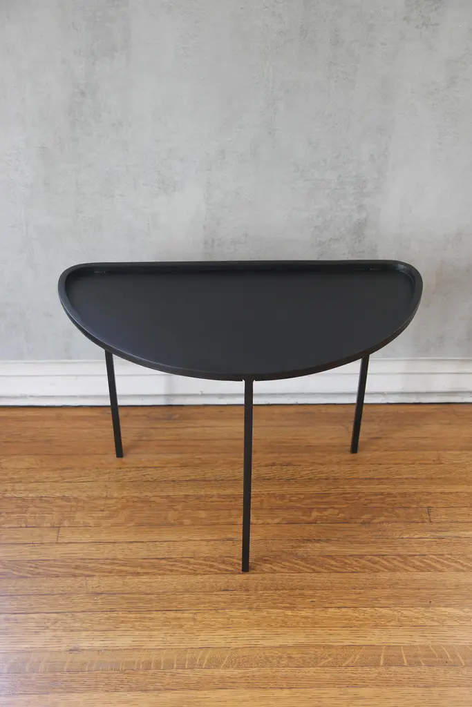 The 'Demi-Lune' from our exclusive Understated Design line. Chic slender three Legs blackened iron on a Demi-Lune Curved Black Powder-Coated top. Impressive Proportions, Versatile, Understated and Chic. Additional Measurement - The Depth top is 1/2 inch deep.