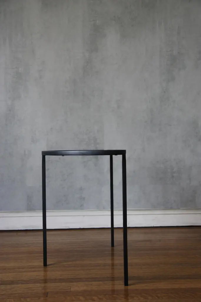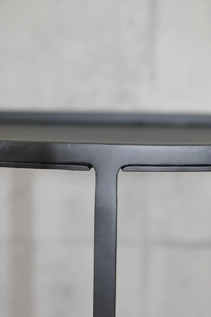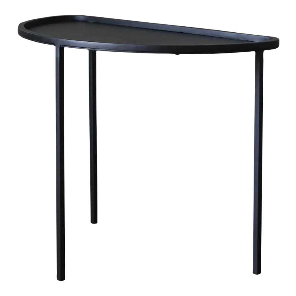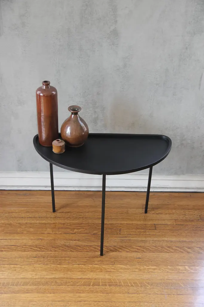 The 'Demi-Lune' from our exclusive Understated Design line. Chic slender three Legs blackened iron on a Demi-Lune Curved Black Powder-Coated top. Impressive Proportions, Versatile, Understated and Chic. Additional Measurement - The Depth top is 1/2 inch deep.
