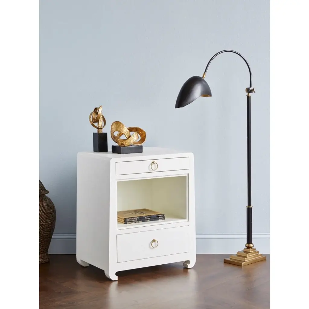 Wrapped in a luxurious lacquered white linen giving rich texture and elegance making this piece uniquely versatile. A classic three drawer display accented with warm brass hardware and softly rounded edges boast a seamless waterfall effect. Paired on either side of a bed or as a solo side table in a living space, the Bryant is a true chameleon piece.