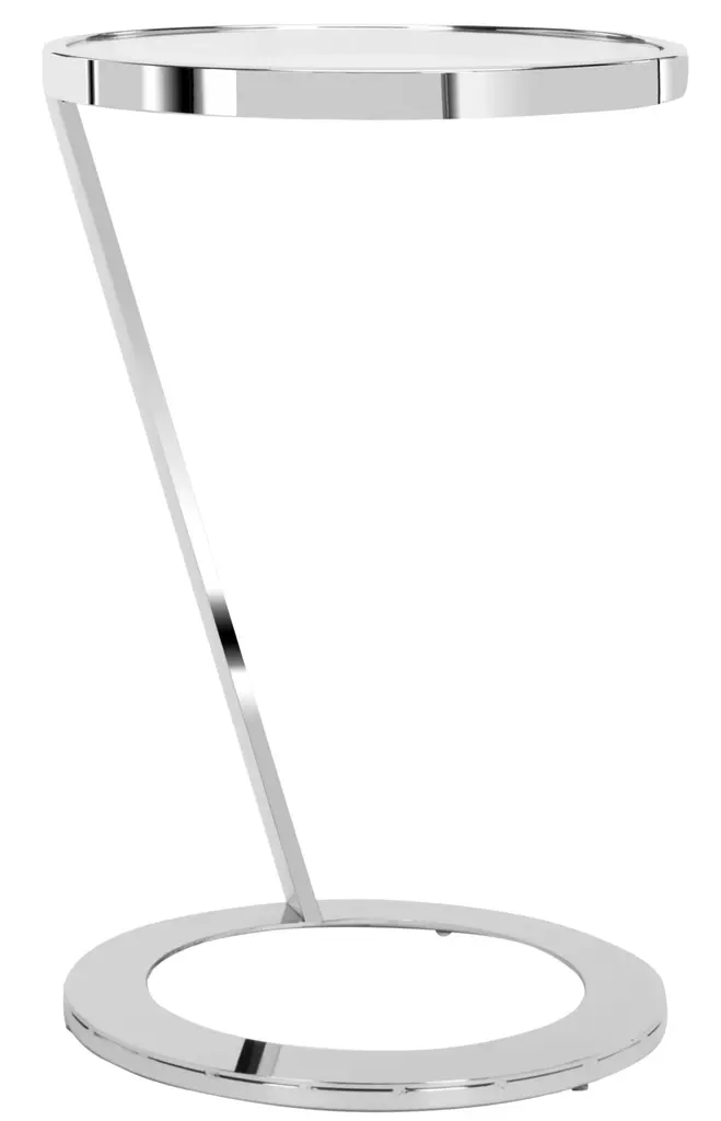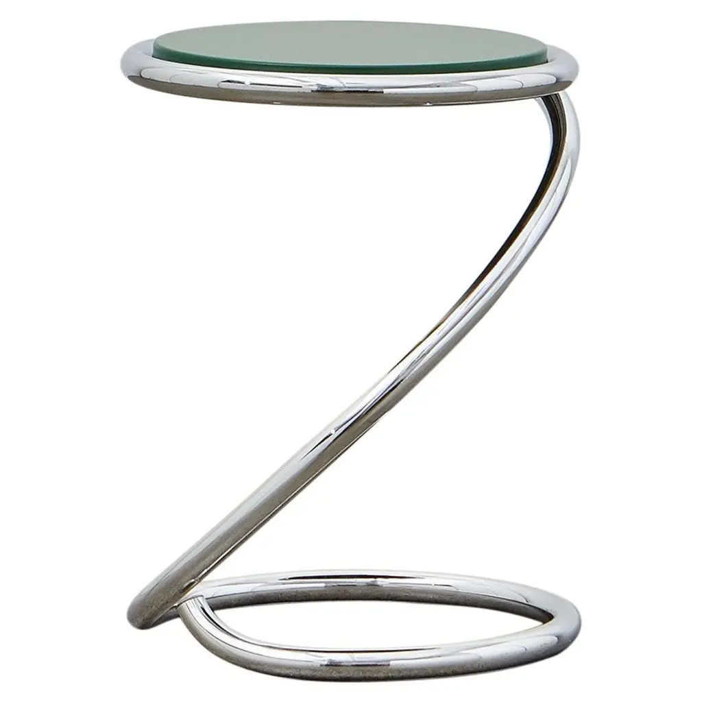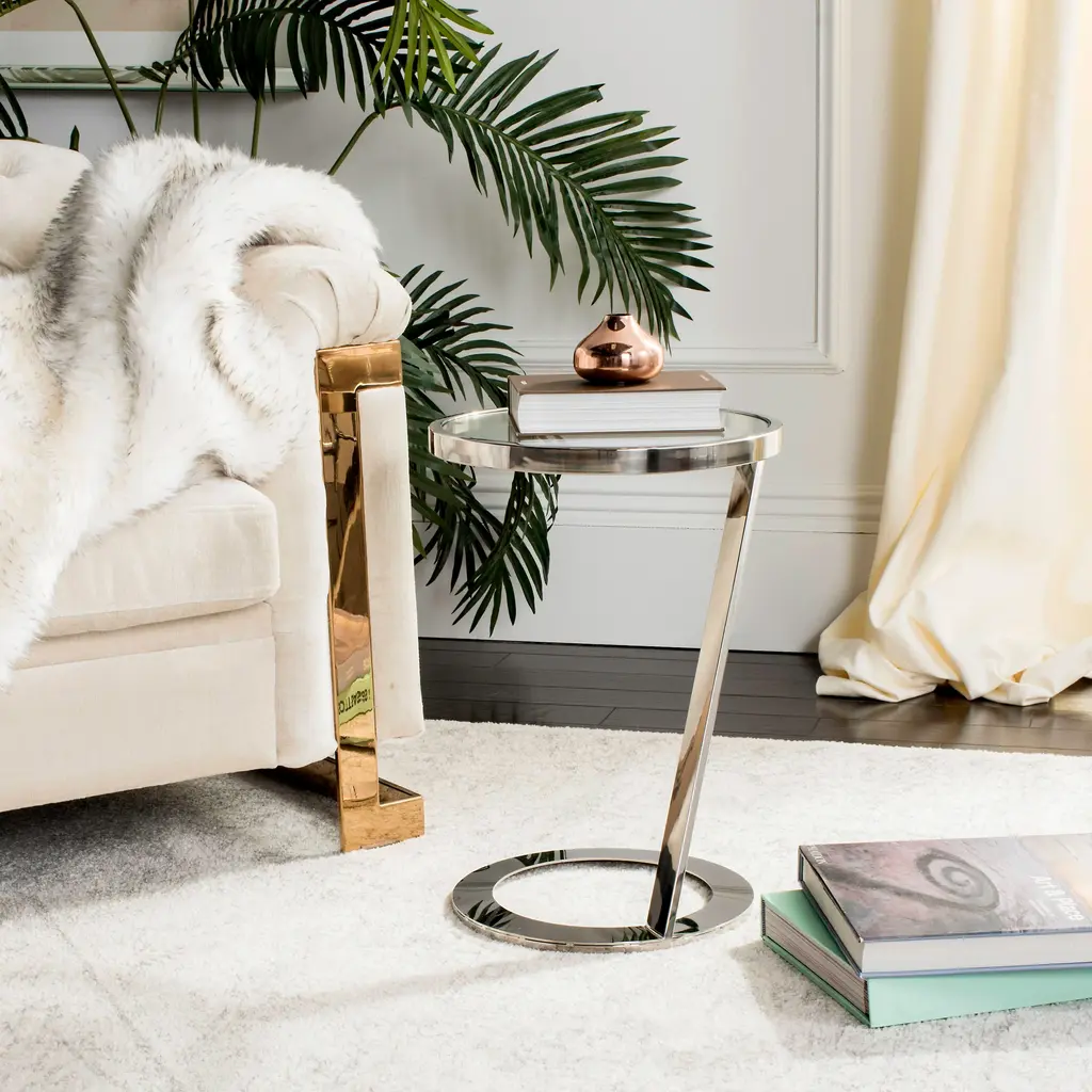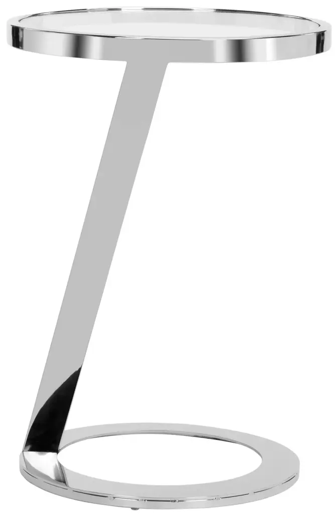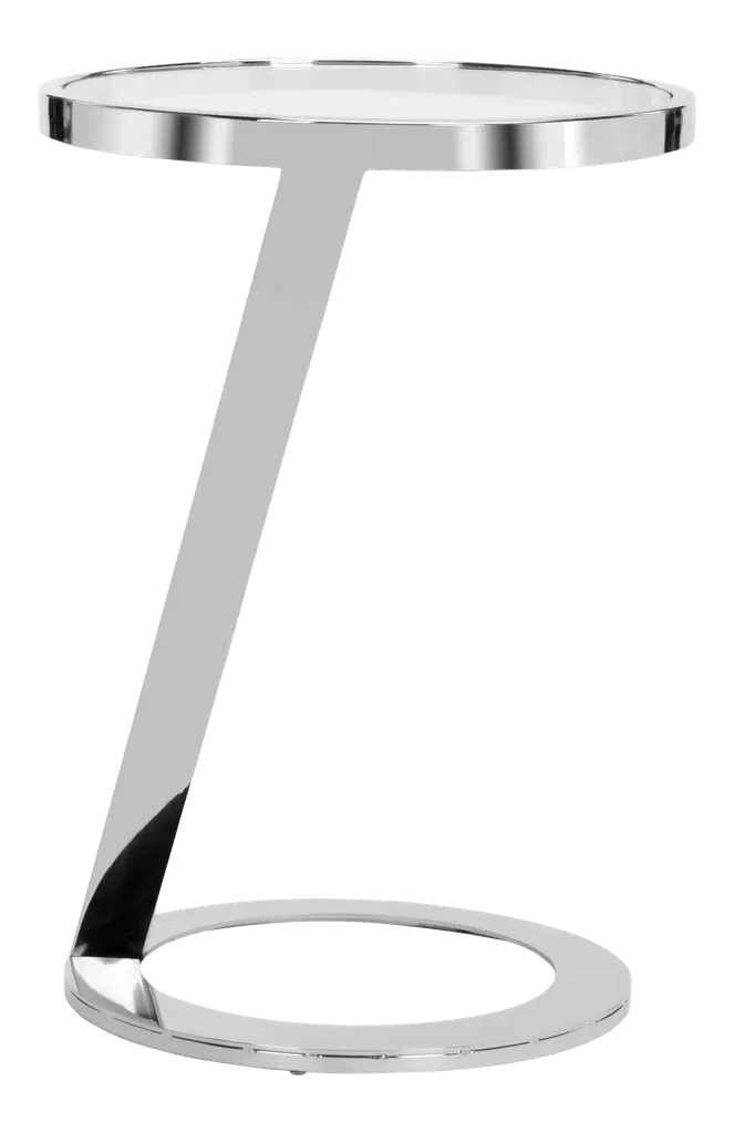 A masterwork of visual splendor, this contemporary Glass Top End Table is a classic. it's ethereal glass top features a sculpted polished chrome interior rim that gracefully extends into it's sleek geometric form. A stunning focal point in any living room. Some assembly required.
