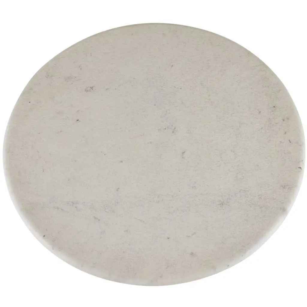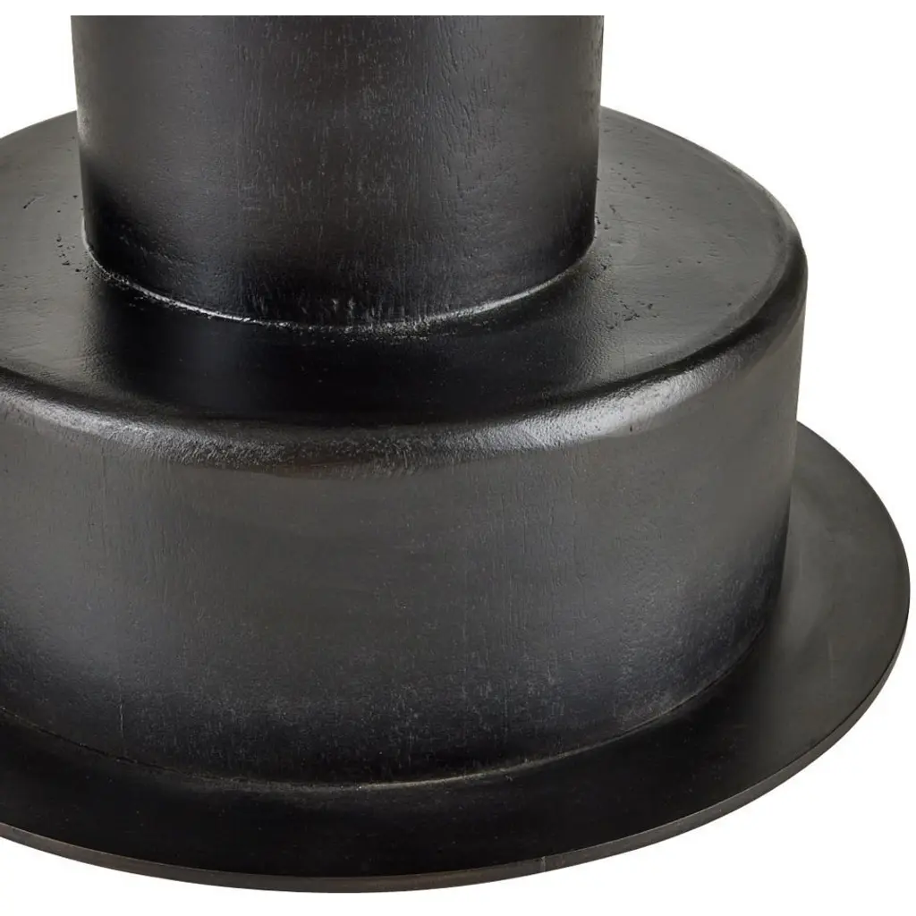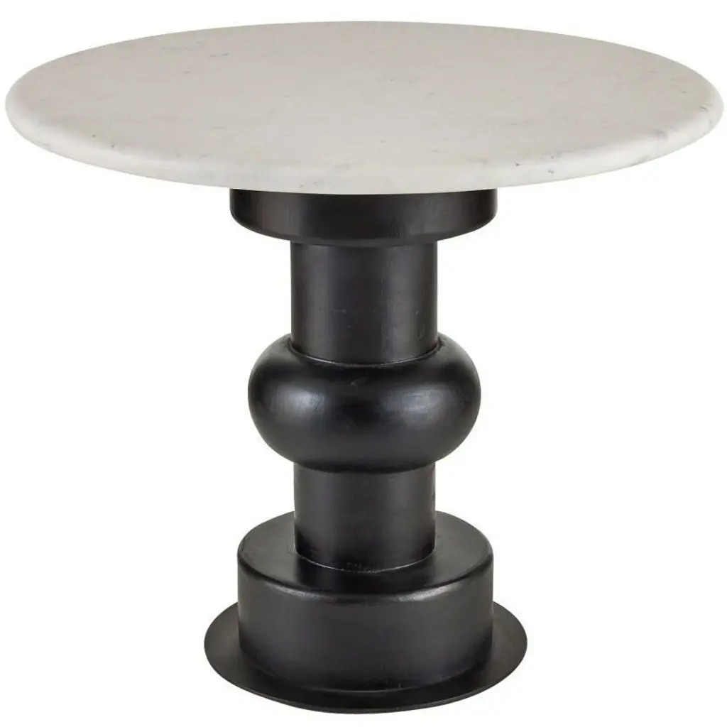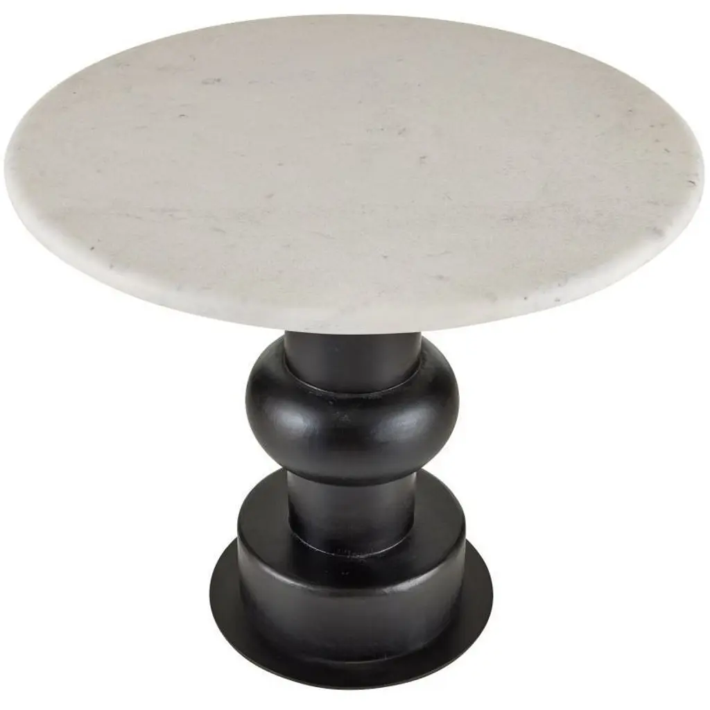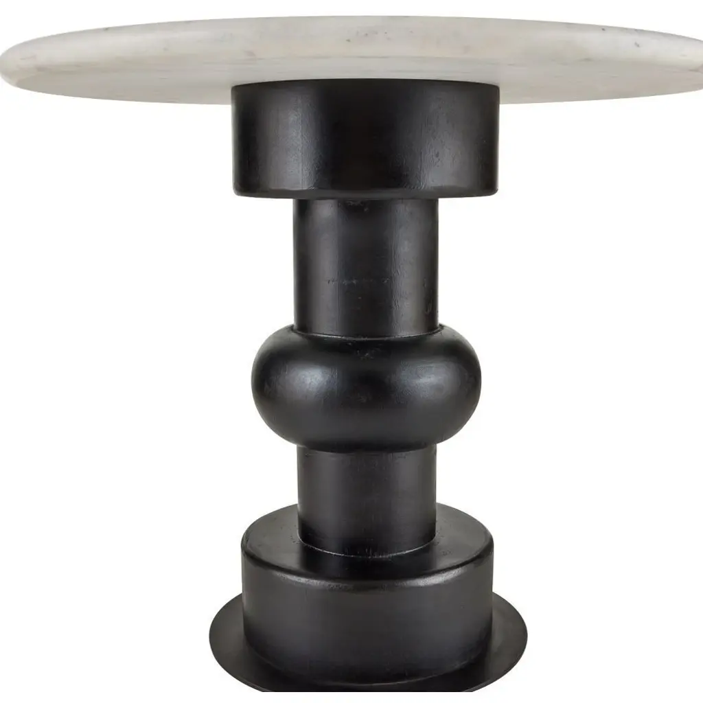 Adding a playful twist to a traditional William and Mary turned leg, this updated end table pairs an ebony oak wood pedestal with a circular top of white sandblasted marble. A bronze-plated iron base anchors the exaggerated proportions. Marble will vary.