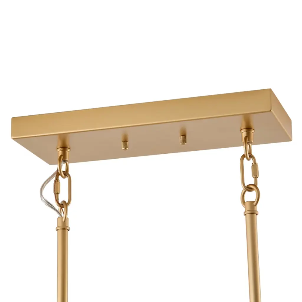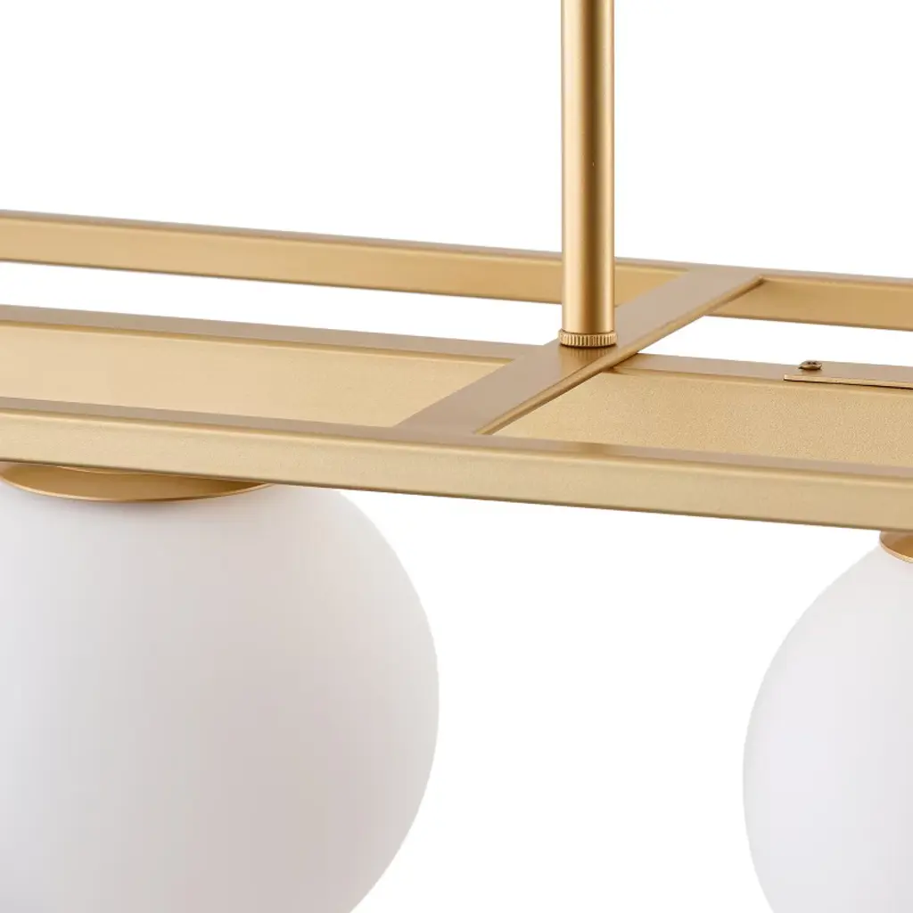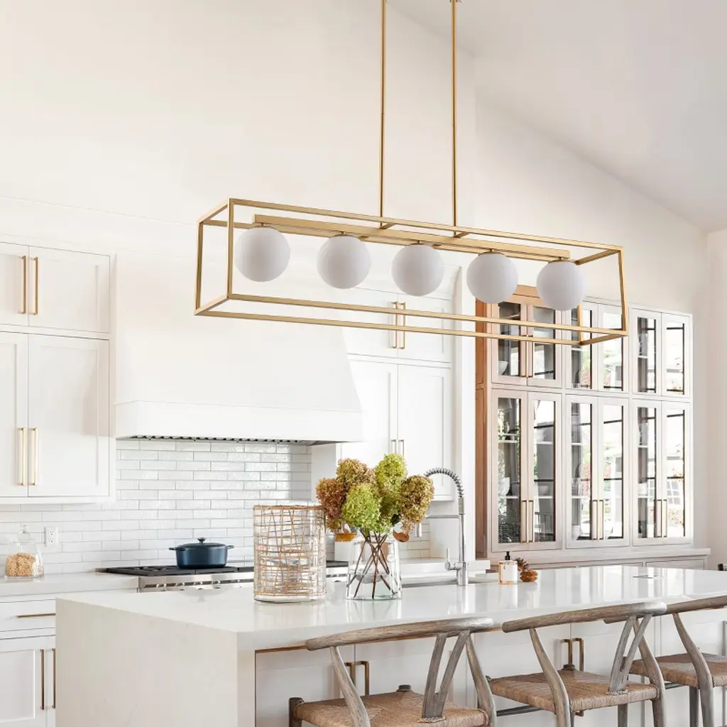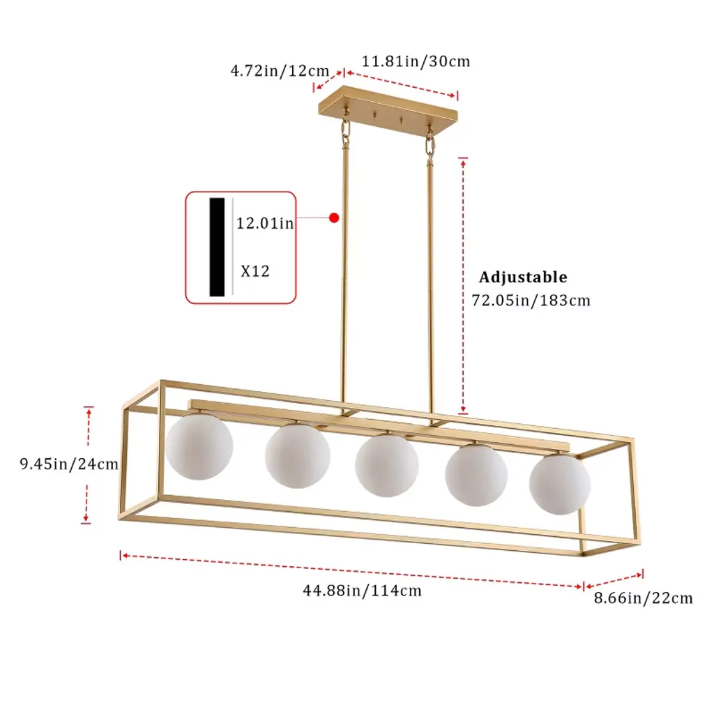 The Dewdrop 44.88-inch 5-light island pendant combines modern elegance with farmhouse charm. Featuring a deep gold iron frame and white frosted glass globes, it creates warm, stylish illumination perfect for kitchen islands, dining rooms, or bars. This ETL-certified fixture supports five E12 bulbs (40W max, 120V) and is built with durable 18AWG Teflon wiring for safe performance. With adjustable rods, it offers flexible installation to fit different ceiling heights, making it a practical and decorative upgrade for your home.