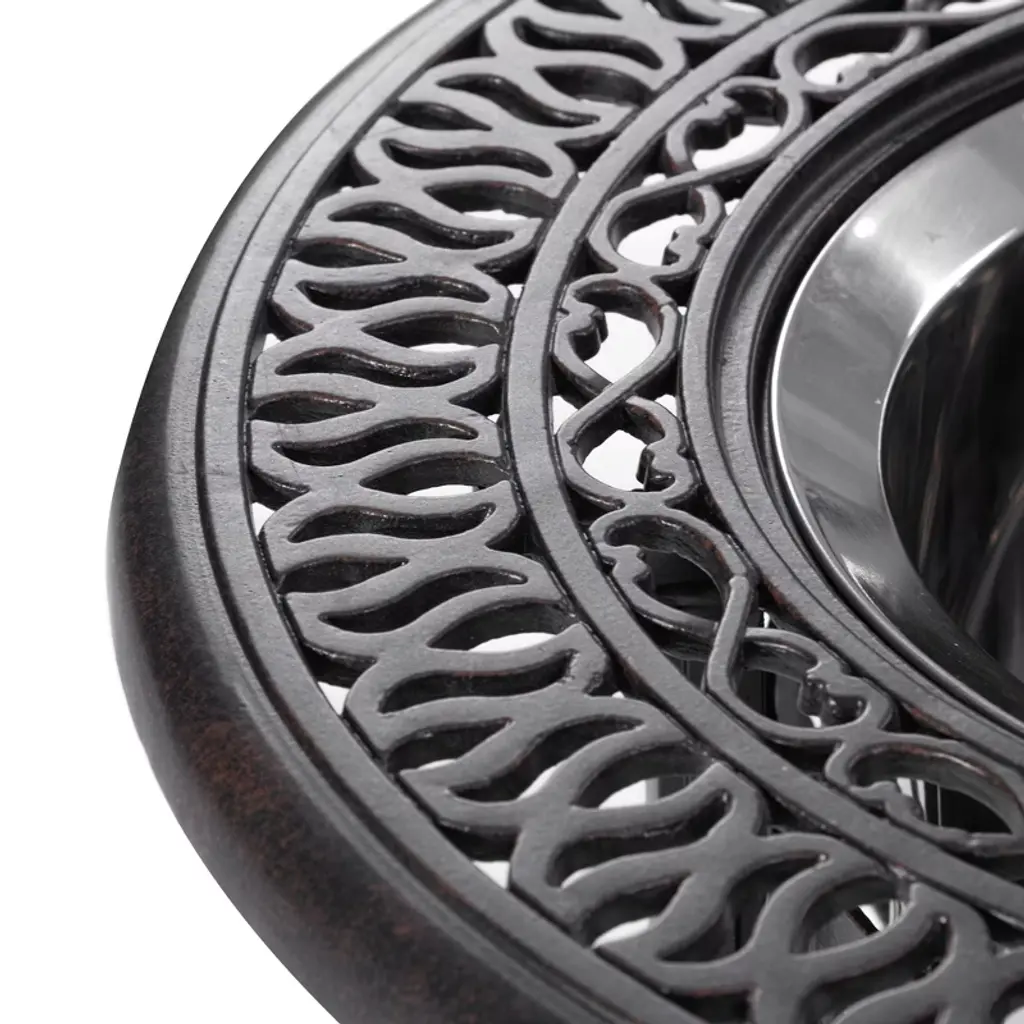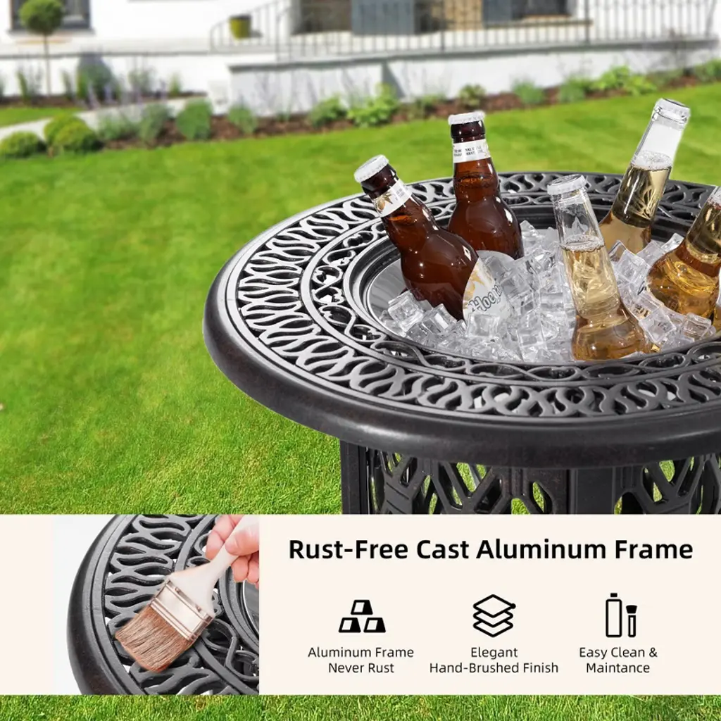Crafted from durable cast aluminum, this 21" Ice Bucket Table combines elegance with functionality, offering a rust-resistant and stylish addition to any space. The hand-brushed finish adds an artisanal touch, while the dual-purpose design lets it transition seamlessly from ice bucket to end table with a matching lid. Perfect for both indoor and outdoor settings, it complements various decor themes. The food-grade stainless steel bucket ensures safe drink cooling, and decorative aluminum accents conceal the interior, enhancing its unique look. Adjustable non-slip pads provide stability, making it the perfect companion for social gatherings or personal relaxation.