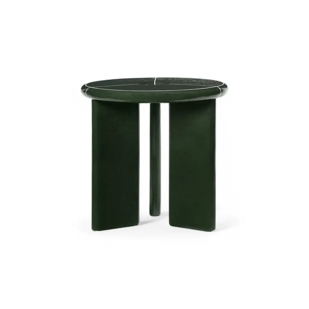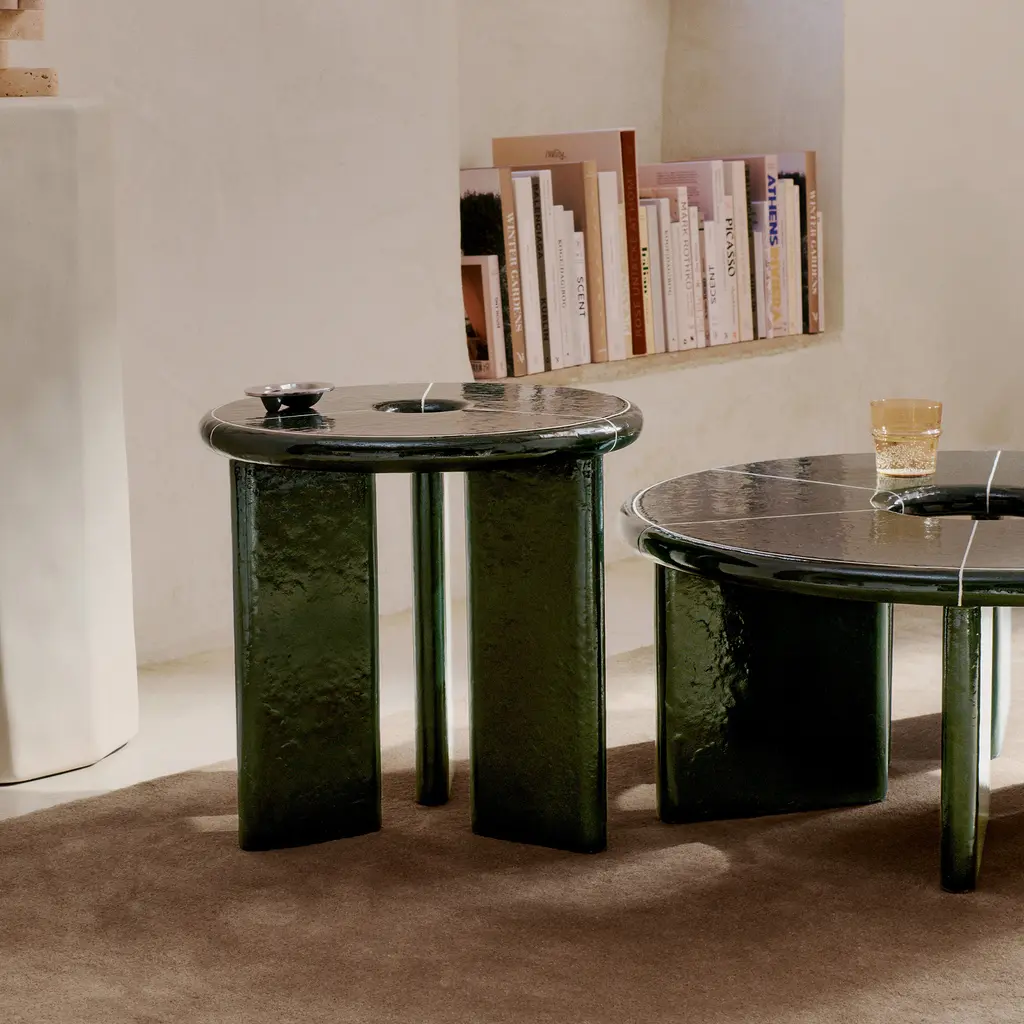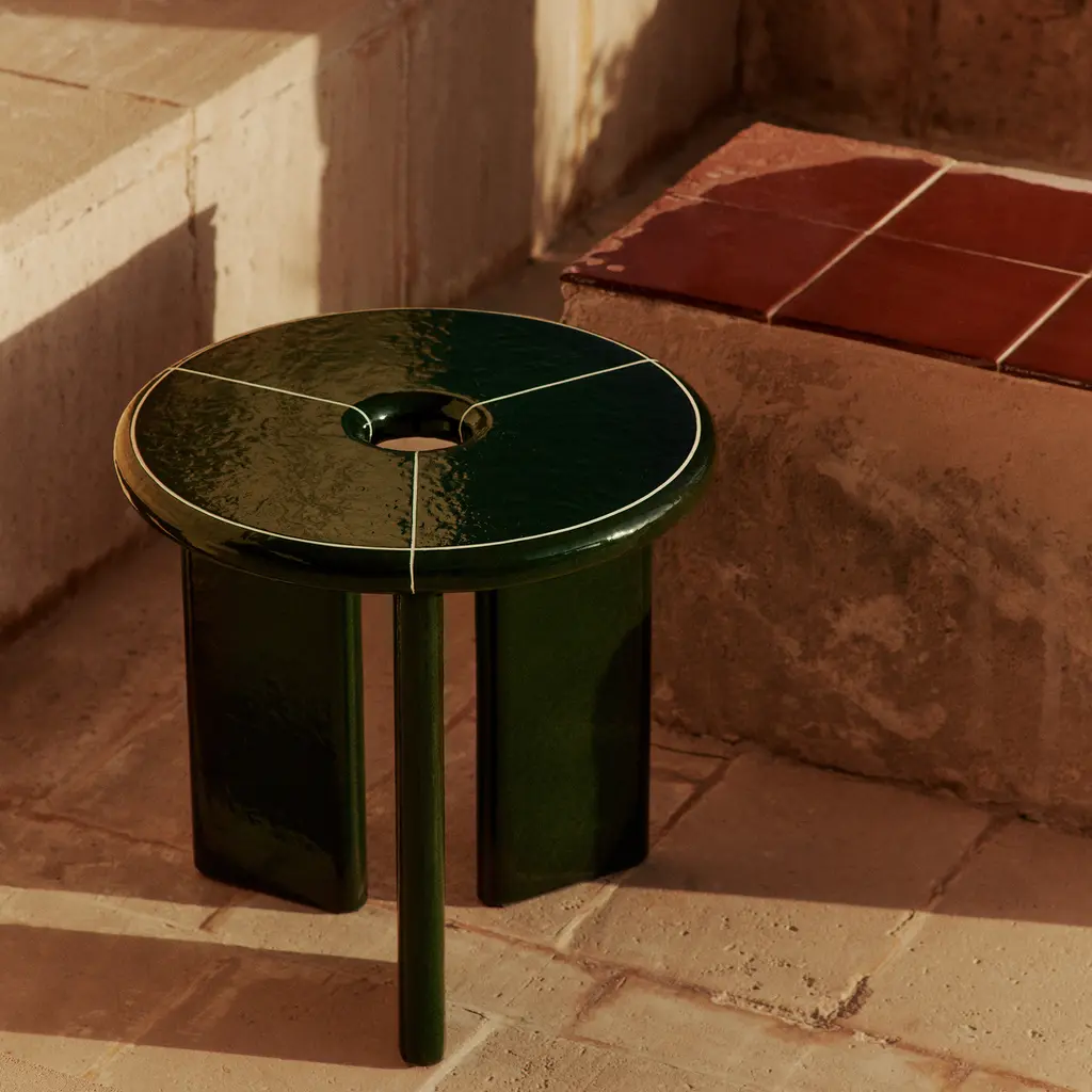 Maximizing visual impact in a compact form, the Ferm Living Deya Side Table features simple geometric shapes, uneven textures, and a dark green color with off-white accents. The design is an homage to Can Lis, the family home of architect Jørn Utzon, and to the coastal landscapes of Mallorca. Crafted with both durability and flexibility in mind, this side table is made from glass fiber reinforced concrete to suit both indoor and outdoor use. The deep green color is perfect to add contrast to a lighter palette, while the off-white grout lines that segment the top add a graphic expression to the design. Finally, a rounded edge softens the bold forms of the Deya Side Table. Perfect as a companion to an armchair or sofa in a living room or a sun lounger in a garden, this Ferm Living Can Lis table can be used individually or alongside the matching coffee table.