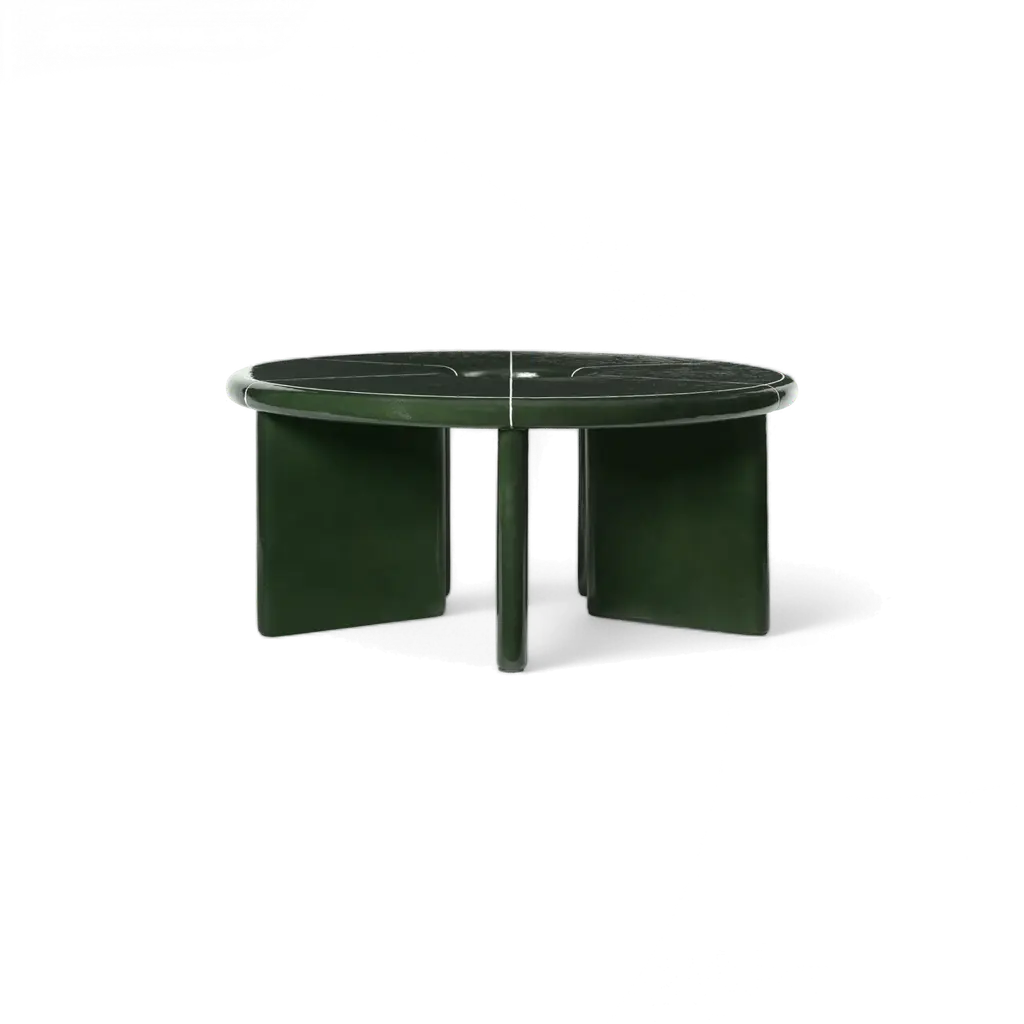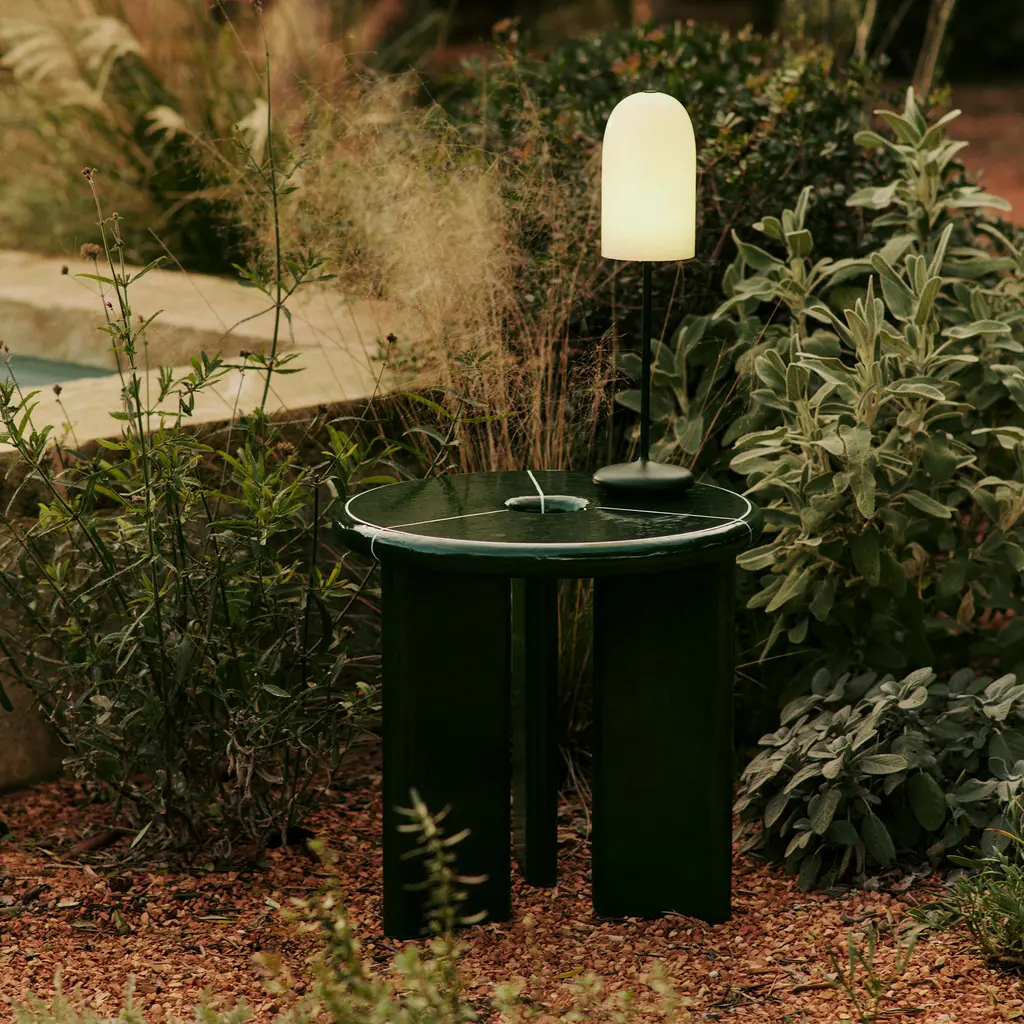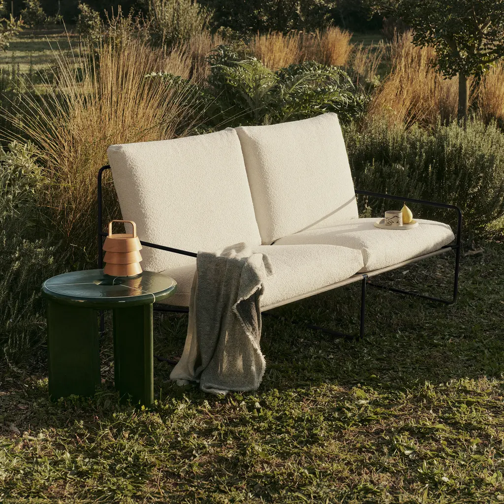 Maximizing visual impact in a compact form, the Ferm Living Deya Side Table features simple geometric shapes, uneven textures, and a dark green color with off-white accents. The design is an homage to Can Lis, the family home of architect Jørn Utzon, and to the coastal landscapes of Mallorca. Crafted with both durability and flexibility in mind, this side table is made from glass fiber reinforced concrete to suit both indoor and outdoor use. The deep green color is perfect to add contrast to a lighter palette, while the off-white grout lines that segment the top add a graphic expression to the design. Finally, a rounded edge softens the bold forms of the Deya Side Table. Perfect as a companion to an armchair or sofa in a living room or a sun lounger in a garden, this Ferm Living Can Lis table can be used individually or alongside the matching coffee table.