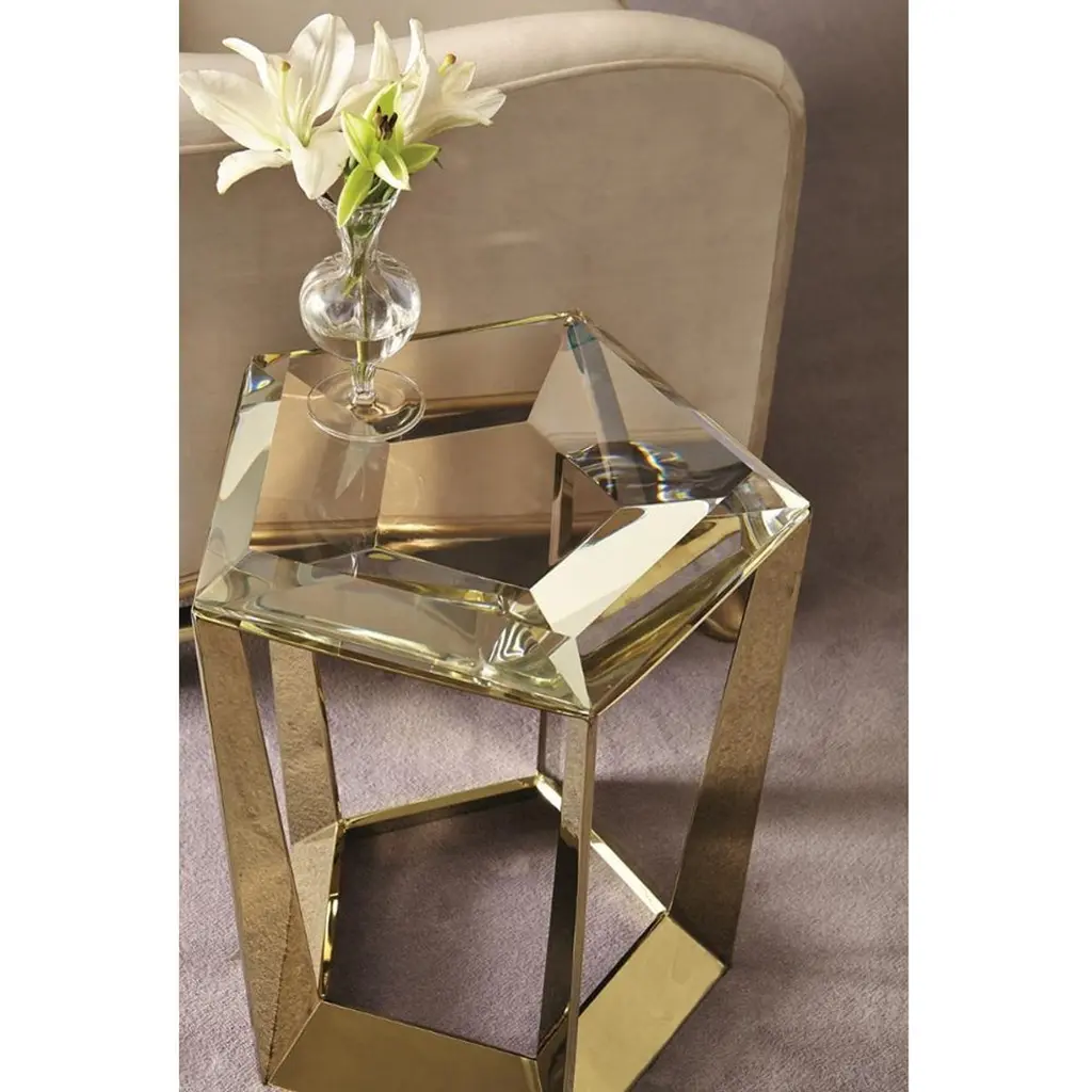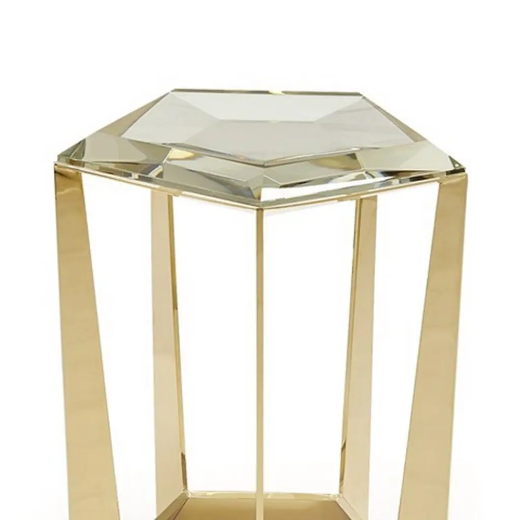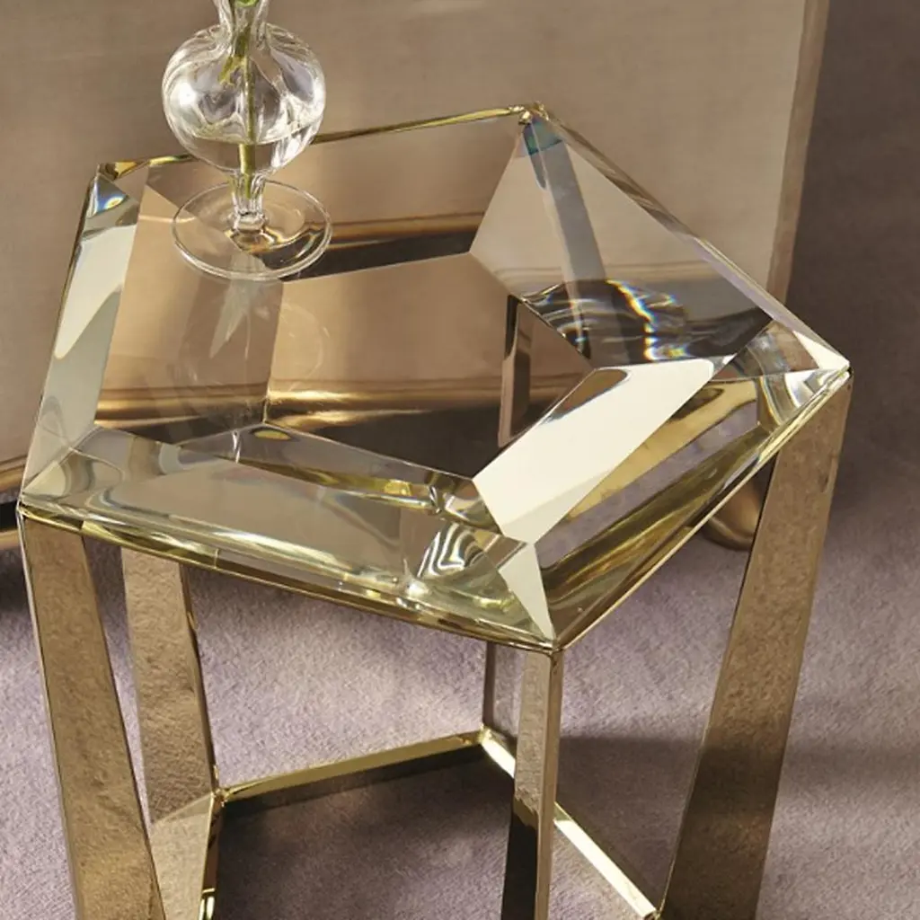SIde table Diamony with structure in steelin gold finish. With bevelled crystal glass top.