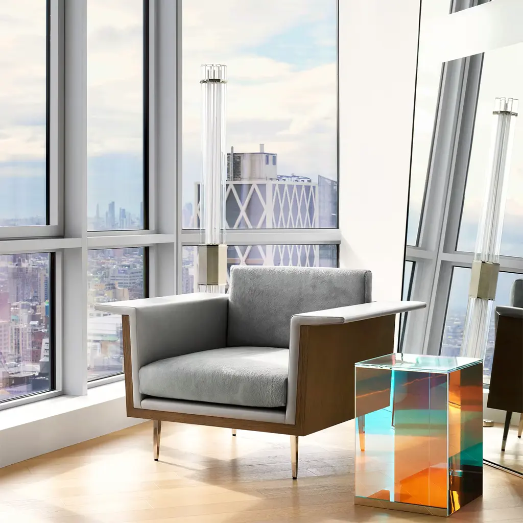 The award-winning Dichroic table is an active statement piece that evolved from Lauren's fascination with early Light and Space artists. As natural light changes throughout the day, the surfaces of the table dramatically shift color, reflecting and refracting colored shadows that create a dialogue with its surrounding environment. These pieces, as many others designed by Lauren Rottet, create a sense of movement and energy in the space.