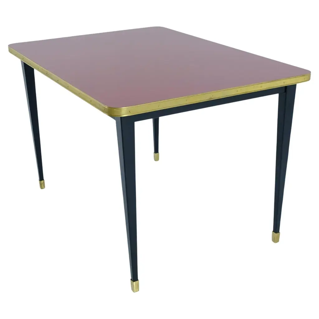Julieta Collection. Table with Black Steel Conical Legs with Brass Bottom End Table Top on High Gloss Laminate Brass Tape FrameIntroducing the stunning dining room table with black powder-coated steel construction, boasting sleek conical legs with brass accents at the bottom. The table top features a high gloss laminate finish, available in a variety of colors to suit your taste and style. The mid-century modern influence is evident in the brass tape frame that adds a touch of sophistication and elegance.This exquisite table is perfect for various settings, including hospitality venues such as hotels, restaurants, and bars, as well as offices or private residences. Designed and fully manufactured in Spain, each piece is meticulously crafted to order, ensuring exceptional quality and attention to detail.The conical legs not only provide stability but also add a touch of contemporary flair, making this dining room table a statement piece in any space. The black powder coating on the steel gives it a sleek and modern look that complements the overall design. The brass accents on the legs add a touch of opulence, elevating the table's aesthetic appeal.The table top is made from high gloss laminate, which not only adds durability but also gives it a lustrous finish that catches the eye. The multiple color options for the table top allow you to choose the perfect hue to match your interior decor. The brass tape frame adds a touch of timeless elegance and serves as a visual highlight that sets this table apart.With its unique blend of mid-century modern style, meticulous craftsmanship, and versatility, this dining room table is a true masterpiece that exudes sophistication and style. Whether it's for entertaining guests in a chic restaurant or adding a touch of elegance to your private residence, this table is sure to make a statement in any setting. Don't hesitate to inquire about specific dimensions, as each piece is made to order, ensuring a perfect fit for your space. Elevate your dining experience with this exceptional dining room table with conical legs, designed to impress and built to last.
