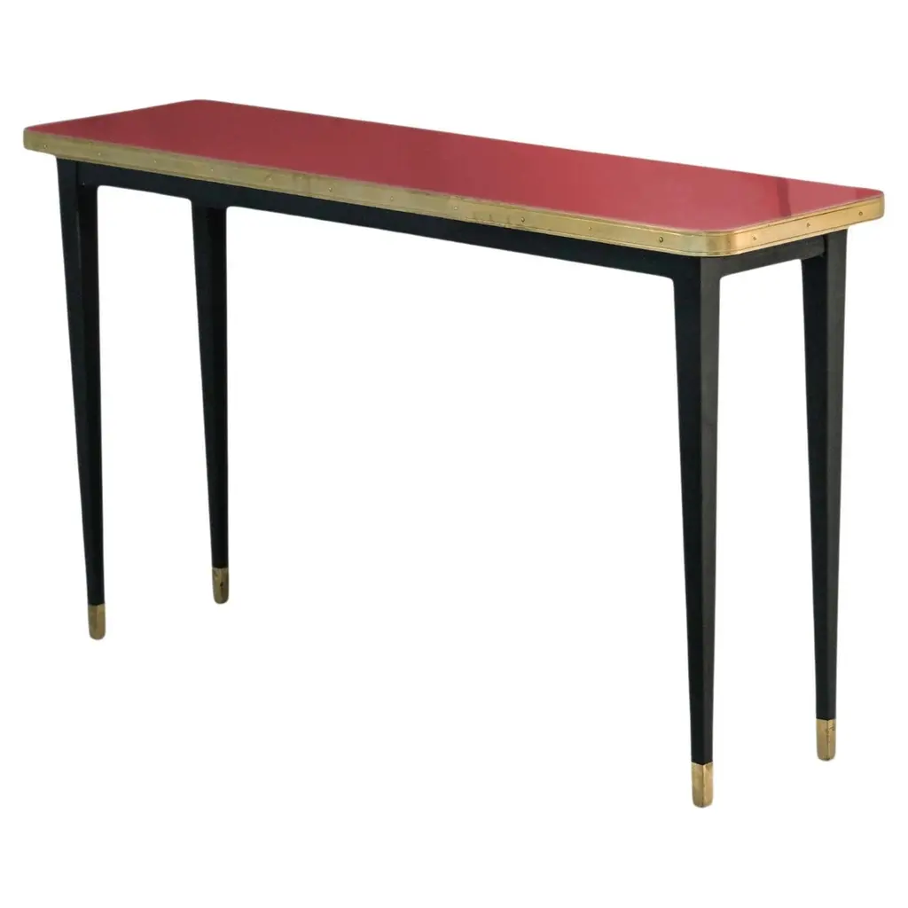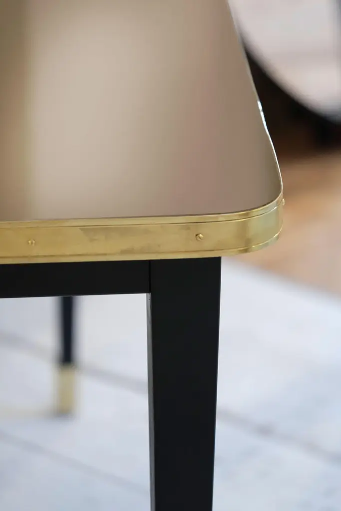 Julieta Collection. Table with Black Steel Conical Legs with Brass Bottom End Table Top on High Gloss Laminate Brass Tape FrameIntroducing the stunning dining room table with black powder-coated steel construction, boasting sleek conical legs with brass accents at the bottom. The table top features a high gloss laminate finish, available in a variety of colors to suit your taste and style. The mid-century modern influence is evident in the brass tape frame that adds a touch of sophistication and elegance.This exquisite table is perfect for various settings, including hospitality venues such as hotels, restaurants, and bars, as well as offices or private residences. Designed and fully manufactured in Spain, each piece is meticulously crafted to order, ensuring exceptional quality and attention to detail.The conical legs not only provide stability but also add a touch of contemporary flair, making this dining room table a statement piece in any space. The black powder coating on the steel gives it a sleek and modern look that complements the overall design. The brass accents on the legs add a touch of opulence, elevating the table's aesthetic appeal.The table top is made from high gloss laminate, which not only adds durability but also gives it a lustrous finish that catches the eye. The multiple color options for the table top allow you to choose the perfect hue to match your interior decor. The brass tape frame adds a touch of timeless elegance and serves as a visual highlight that sets this table apart.With its unique blend of mid-century modern style, meticulous craftsmanship, and versatility, this dining room table is a true masterpiece that exudes sophistication and style. Whether it's for entertaining guests in a chic restaurant or adding a touch of elegance to your private residence, this table is sure to make a statement in any setting. Don't hesitate to inquire about specific dimensions, as each piece is made to order, ensuring a perfect fit for your space. Elevate your dining experience with this exceptional dining room table with conical legs, designed to impress and built to last.
