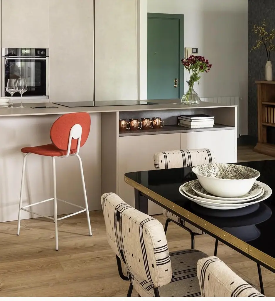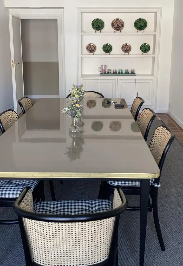 Julieta Collection. Table with Black Steel Conical Legs with Brass Bottom End Table Top on High Gloss Laminate Brass Tape FrameIntroducing the stunning dining room table with black powder-coated steel construction, boasting sleek conical legs with brass accents at the bottom. The table top features a high gloss laminate finish, available in a variety of colors to suit your taste and style. The mid-century modern influence is evident in the brass tape frame that adds a touch of sophistication and elegance.This exquisite table is perfect for various settings, including hospitality venues such as hotels, restaurants, and bars, as well as offices or private residences. Designed and fully manufactured in Spain, each piece is meticulously crafted to order, ensuring exceptional quality and attention to detail.The conical legs not only provide stability but also add a touch of contemporary flair, making this dining room table a statement piece in any space. The black powder coating on the steel gives it a sleek and modern look that complements the overall design. The brass accents on the legs add a touch of opulence, elevating the table's aesthetic appeal.The table top is made from high gloss laminate, which not only adds durability but also gives it a lustrous finish that catches the eye. The multiple color options for the table top allow you to choose the perfect hue to match your interior decor. The brass tape frame adds a touch of timeless elegance and serves as a visual highlight that sets this table apart.With its unique blend of mid-century modern style, meticulous craftsmanship, and versatility, this dining room table is a true masterpiece that exudes sophistication and style. Whether it's for entertaining guests in a chic restaurant or adding a touch of elegance to your private residence, this table is sure to make a statement in any setting. Don't hesitate to inquire about specific dimensions, as each piece is made to order, ensuring a perfect fit for your space. Elevate your dining experience with this exceptional dining room table with conical legs, designed to impress and built to last.