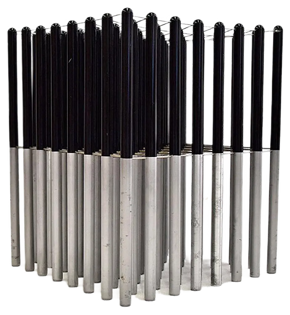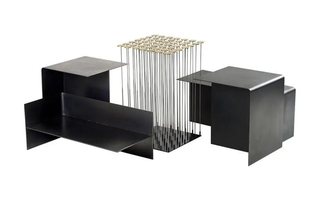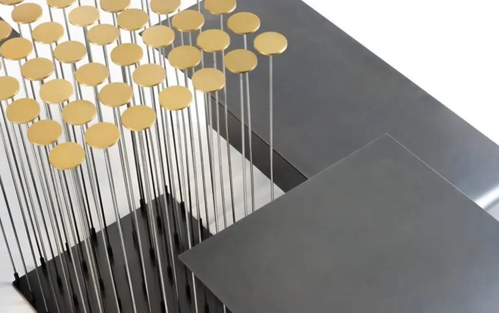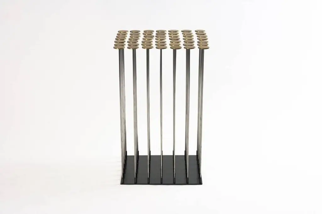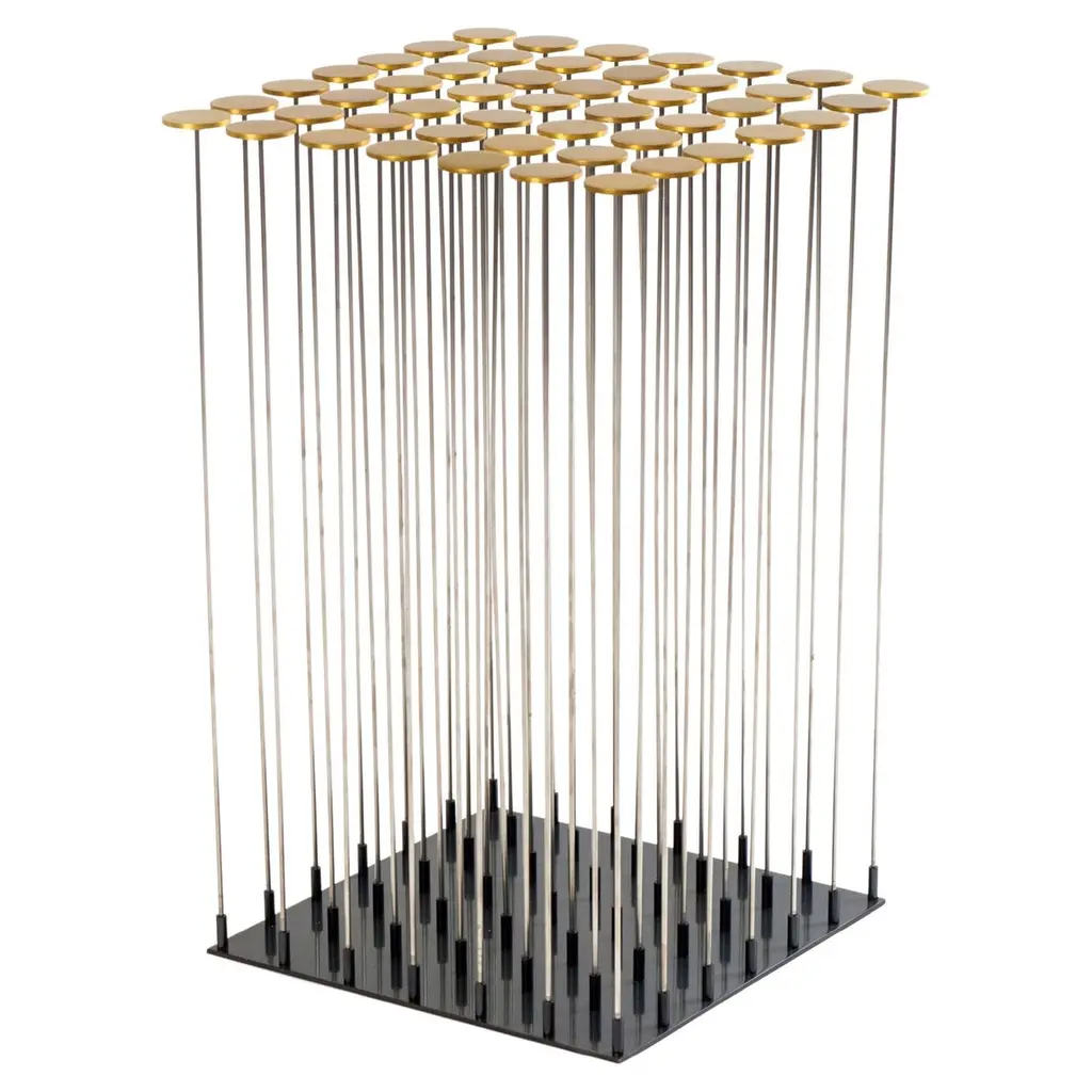 With a nod to Harry Bertoia, the Dischi side table is both sculptural as it is functional. Amazingly stabile as a table surface, this piece is a willowy yet architectural statement which can also be customized into various shapes. Discs made of milled brass and a darkened stainless steel base, the stainless steel rods allow for the gentile movement of the tabletop.