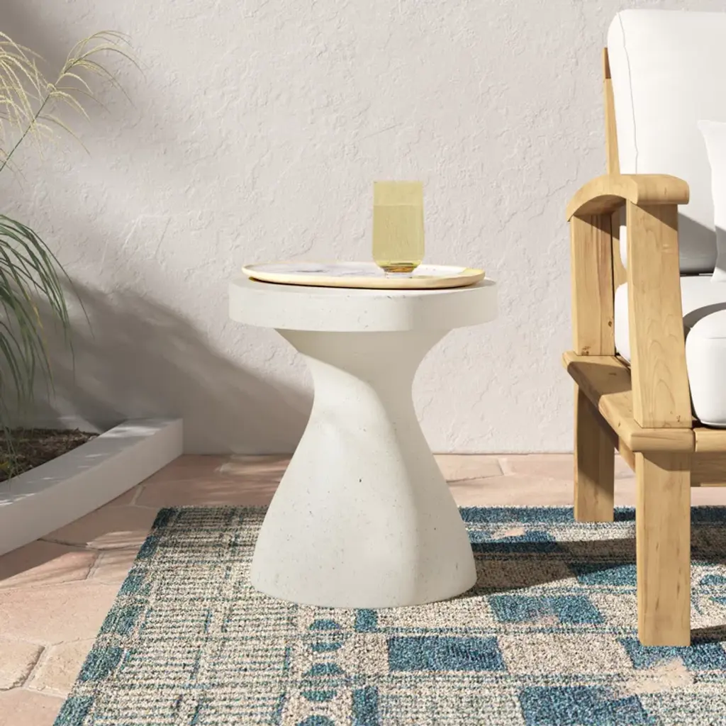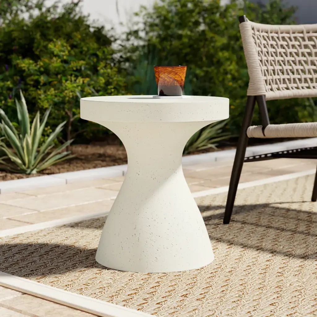 Say hello to your patio's new best friend. Crafted from durable concrete, this outdoor side table boasts an architectural hourglass pedestal shape. Its round top is just the right size for holding a cold drink or your current read. The natural texture adds extra character, making each piece feel unique. Plus, it arrives fully assembled, so you can enjoy it right away.
