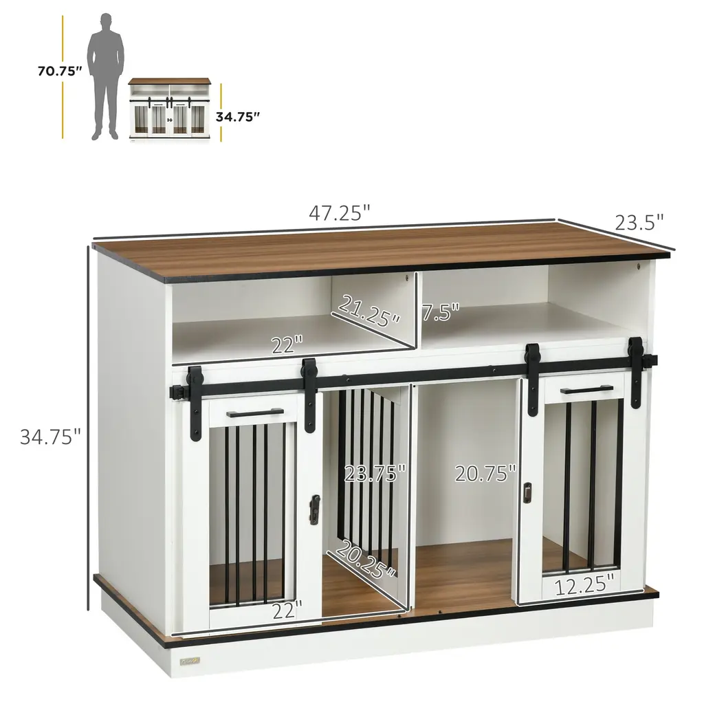 Dog Crate End Table With Removable Divider & Open Shelves, Sliding Doors, Modern Style For Large Or Small Dogs - White - 47.25" W X 23.5" D X 34.75" H