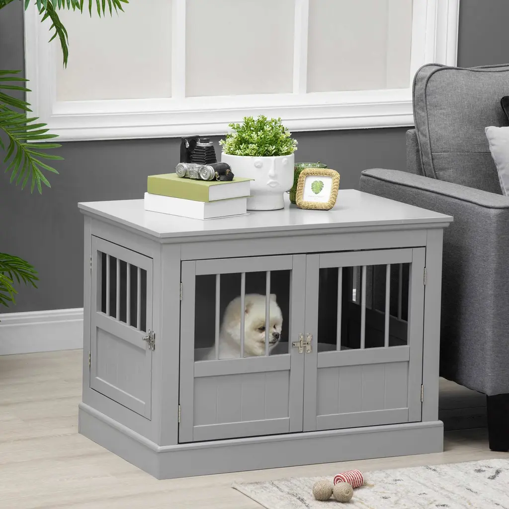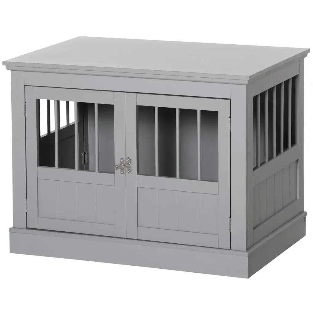 Dog Crate End Table With Triple Doors, Wooden Dog Crate Furniture Indoor Use, Puppy Crate With And Steel Tubes, For Small Dogs - Grey