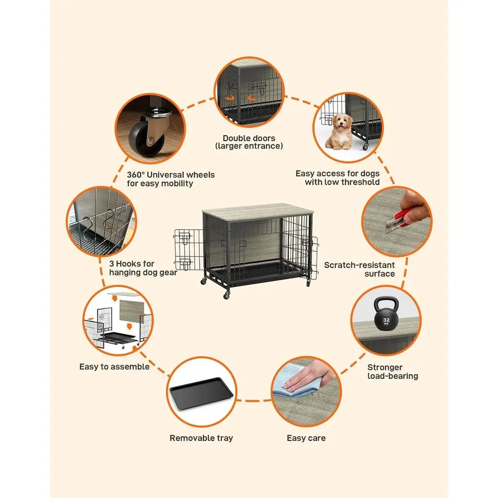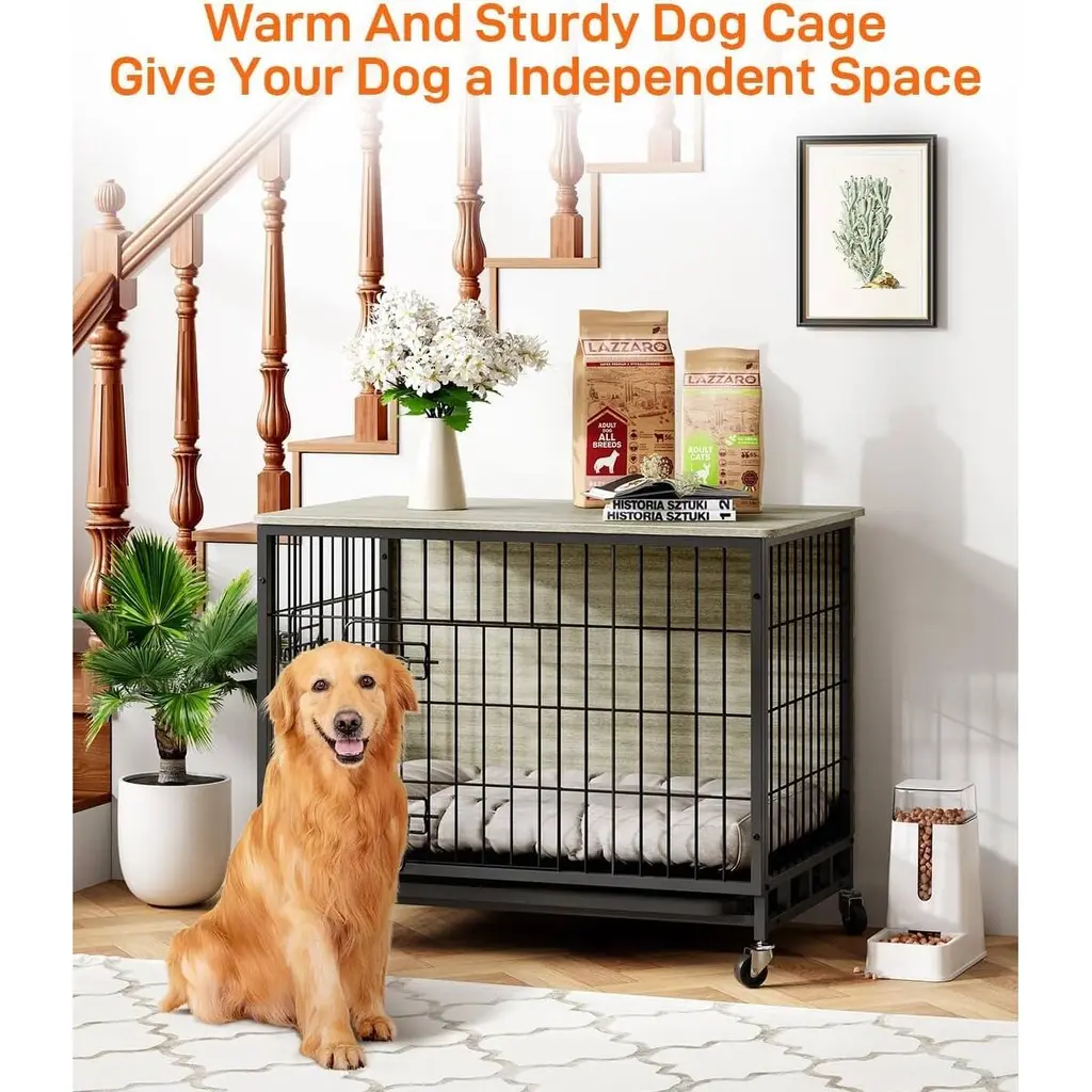 1. Slide-Out Tray for Simplified Cleanups: Maintain cleanliness effortlessly with a removable tray that slides out for rapid cleaning. This feature supports a neat, inviting space for your large dog without constant maintenance hassles.2. Chic Multi-Use Kennel: More than just a kennel, this unit also serves as stylish furniture. Its robust design supports various uses, blending seamlessly with your existing décor while providing a secure area for your dog.3. Robust Construction, Optimal Ventilation: Constructed to support larger dogs, this kennel provides a strong frame and excellent ventilation. The design ensures a spacious and airy environment, offering a comfortable and secure retreat for your pet.4. Easy to Move and Stabilize: Featuring wheels for convenient maneuverability, this kennel can be effortlessly transported across different rooms. Lockable wheels ensure that it remains fixed in your desired location.5. Streamlined Setup Process: Designed for easy assembly, this kennel includes detailed instructions and all the necessary tools. The process is straightforward, enhancing your experience with added convenience for setup and use.
