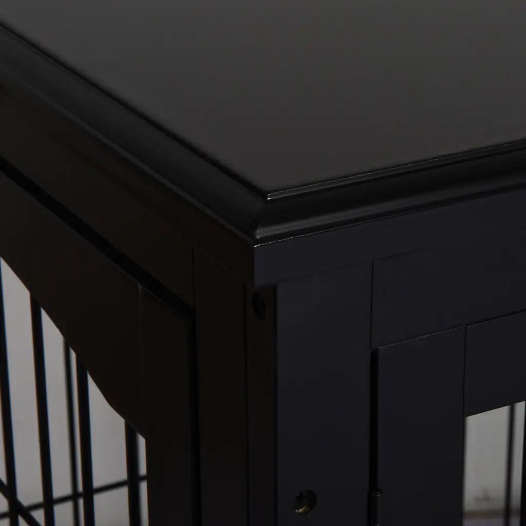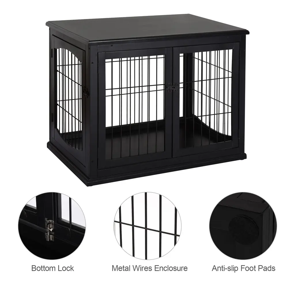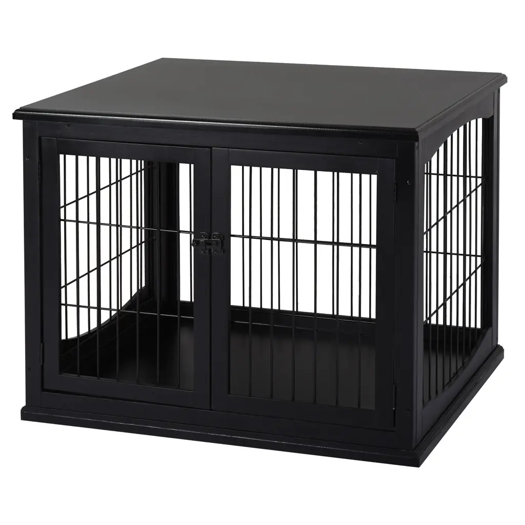 End Table: This furniture style dog crate will allow you to place anything from drinks to TV remotes down on top of its flat surface, acting as a coffee table while the dog can sit inside.The 2-in-1 design eliminates the feeling of too many items overwhelming a small room, providing a convenient tabletop and a dog crate.Double Entrances: The two-way entry makes it easy to let the dog out, allowing you to unlatch the door in a quick moment, reaching from any angle while sitting on the couch or in a chair. With French doors on the side, the doors of this wood dog crate treat your furry friend with style.Decorative: This dog kennel end table has a sleek modern appearance with an arched window shape around the wire on the side walls, adding detail for an esthetic that fits easily with most décor.Quality Material: The dog kennel furniture has solid and sturdy P2 grade MDF panels with metal wires, offering long-lasting use.Dog Crate Table Information: Overall Dimensions: 23" L x 32" W x 26" H. Front Door Size: 17.75" W x 20.75" H. Side Door Size (Single Door Size): 13.75" W x 20.75" H. Weight Capacity: 66 lbs. Suitable for medium and small dogs up to 44 lbs in weight and 25.5" in length. Assembly required.