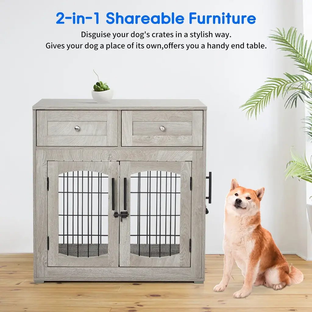 This multifunctional dog crate is crafted from chew-resistant MDF and reinforced with steel bars for enhanced durability and stability. Designed with a wide desktop and two storage drawers, it offers ample space for displaying décor and organizing pet supplies. The included removable cushion provides comfort for your dog while keeping the area clean. With three doors for easy access, this stylish crate also doubles as a side table or nightstand, seamlessly integrating into your home decor and enhancing both functionality and style. Key Features: