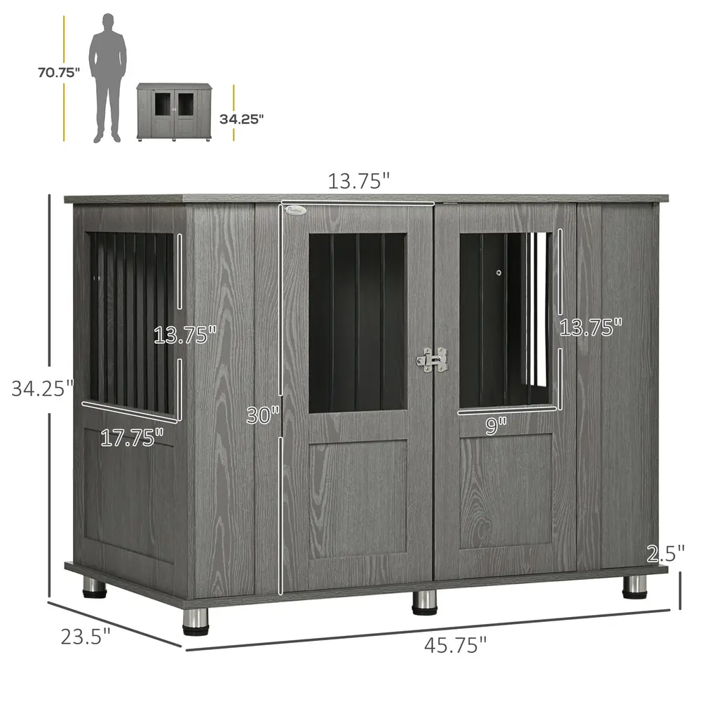 Warm tips: Product after-sales guide 🚀Thank you for purchasing our products!Please do not return the product in case of problems. Please take a photo and send it to us, we will quickly process and provide a reasonable solution. Thank you for your cooperation! 🙏 1.Convenient & Versatile: This wood dog crate is light and easy to assemble, making it suitable for extra large dogs less than 25.5" & 77 lbs. Also, with its flat-top roof, you can place pet supplies and other items. 2.Safe & Ventilated: The magnetic doors are easy to open, while the latches will keep your pet securely confined and safe. At the same time, the front and side steel wire windows of the dog kennel furniture provide proper ventilation and a good view for both you and your pets. 3.Solid Structure: Steel and particleboard with a wood-like finish make this wooden dog kennel durable and stylish. Since it has a rustic esthetic, you can easily combine it with your other home décor. 4.Adjustable Feet: The footpads are adjustable to keep the dog crate end table stable on uneven surfaces. The elevated base also helps protect the bottom from damage or moisture. 5.Dog Crate Table Information: Overall Dimensions: 45.75" L x 23.5" W x 34.25" H. Door Dimensions: 13.75" L x 30" W. Suitable for extra large dogs up to 77 lbs. in weight and within 25.5" in length. Weight Capacity of Top: 110lbs.